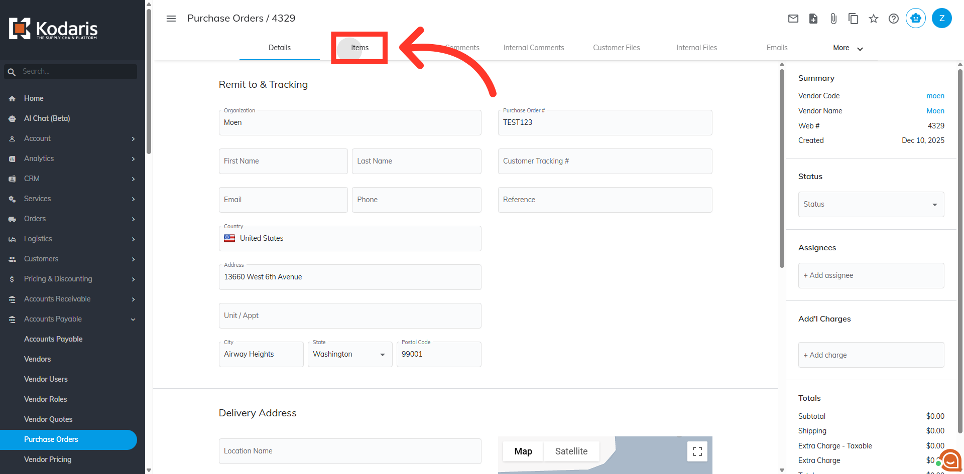 Next, click the "Items" tab to manage the products included in the purchase order.