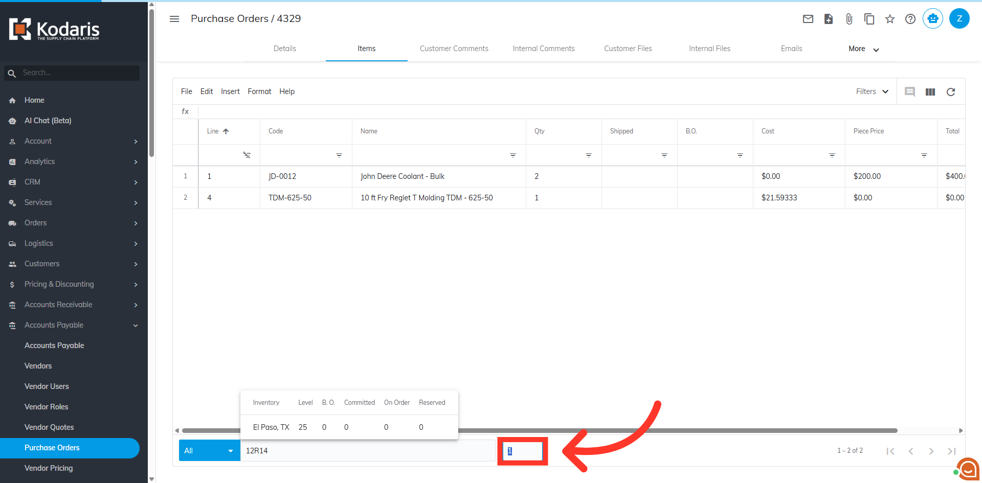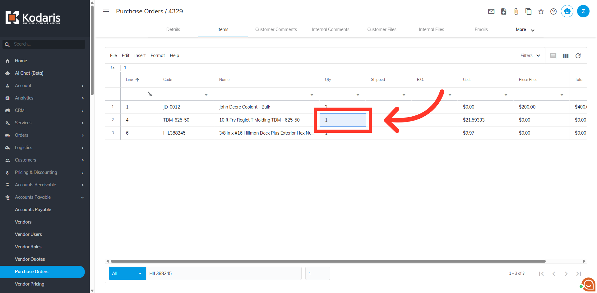 Then, add the quantity you wish to order and hit enter to add the item to the Purchase Order.