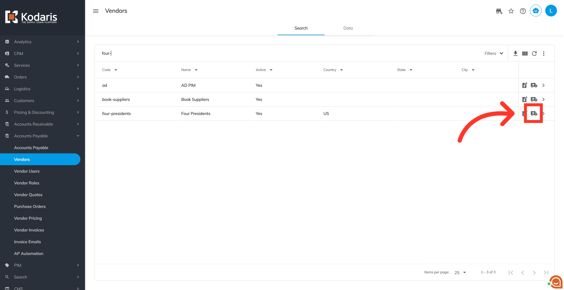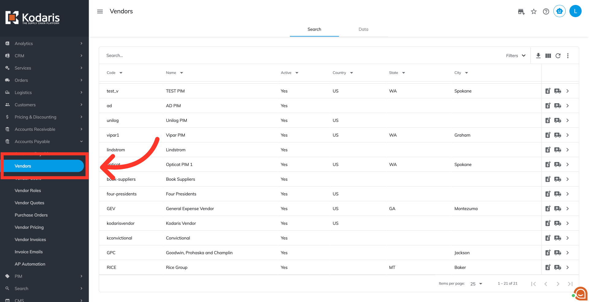 Then, click "Vendors". In order to access "Vendors" the account will need to be set up either as an "administrator" or a "superuser", or have the appropriate roles: "vendorView", "vendorEdit", "purchaseOrderView" and "purchaseOrderEdit."