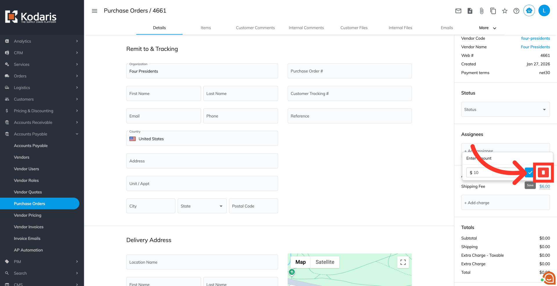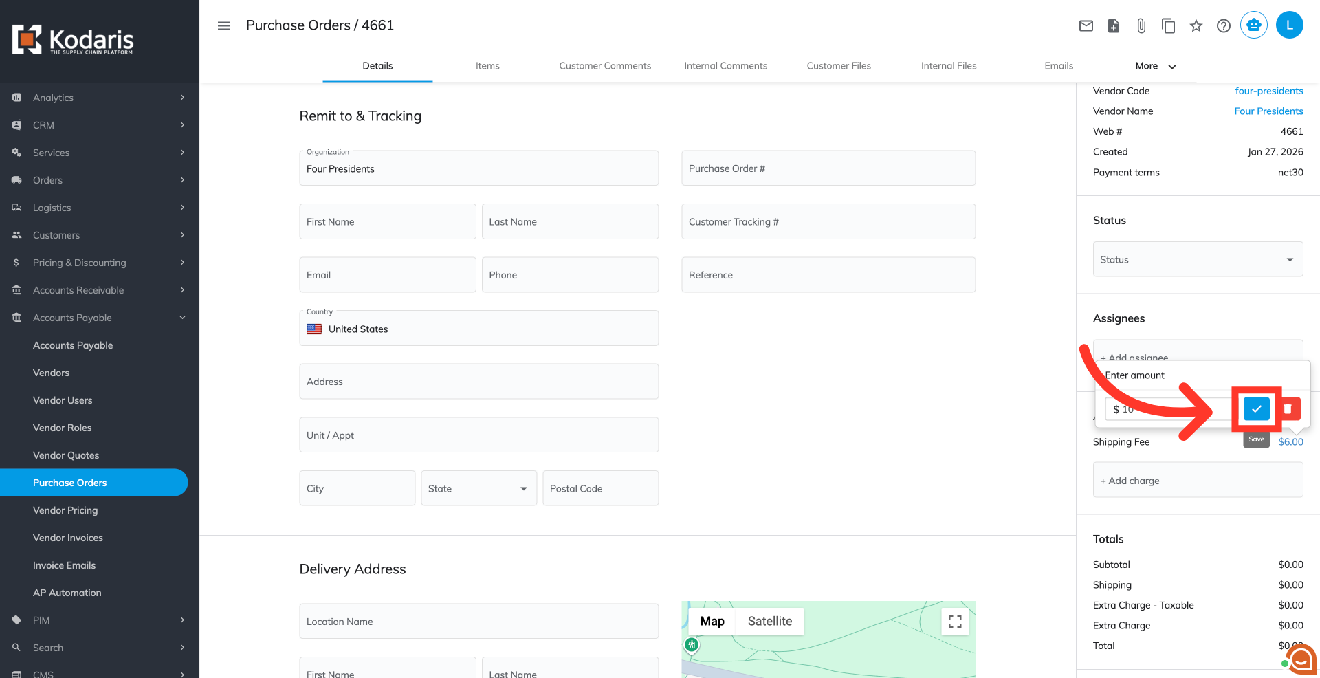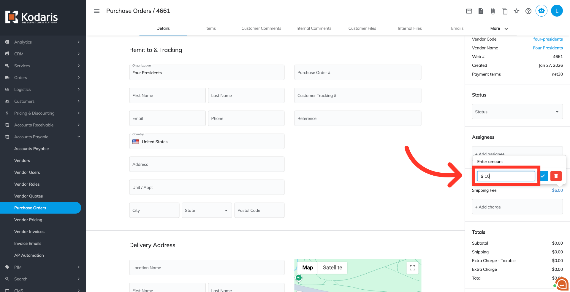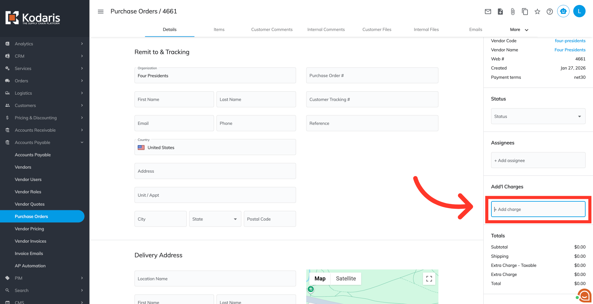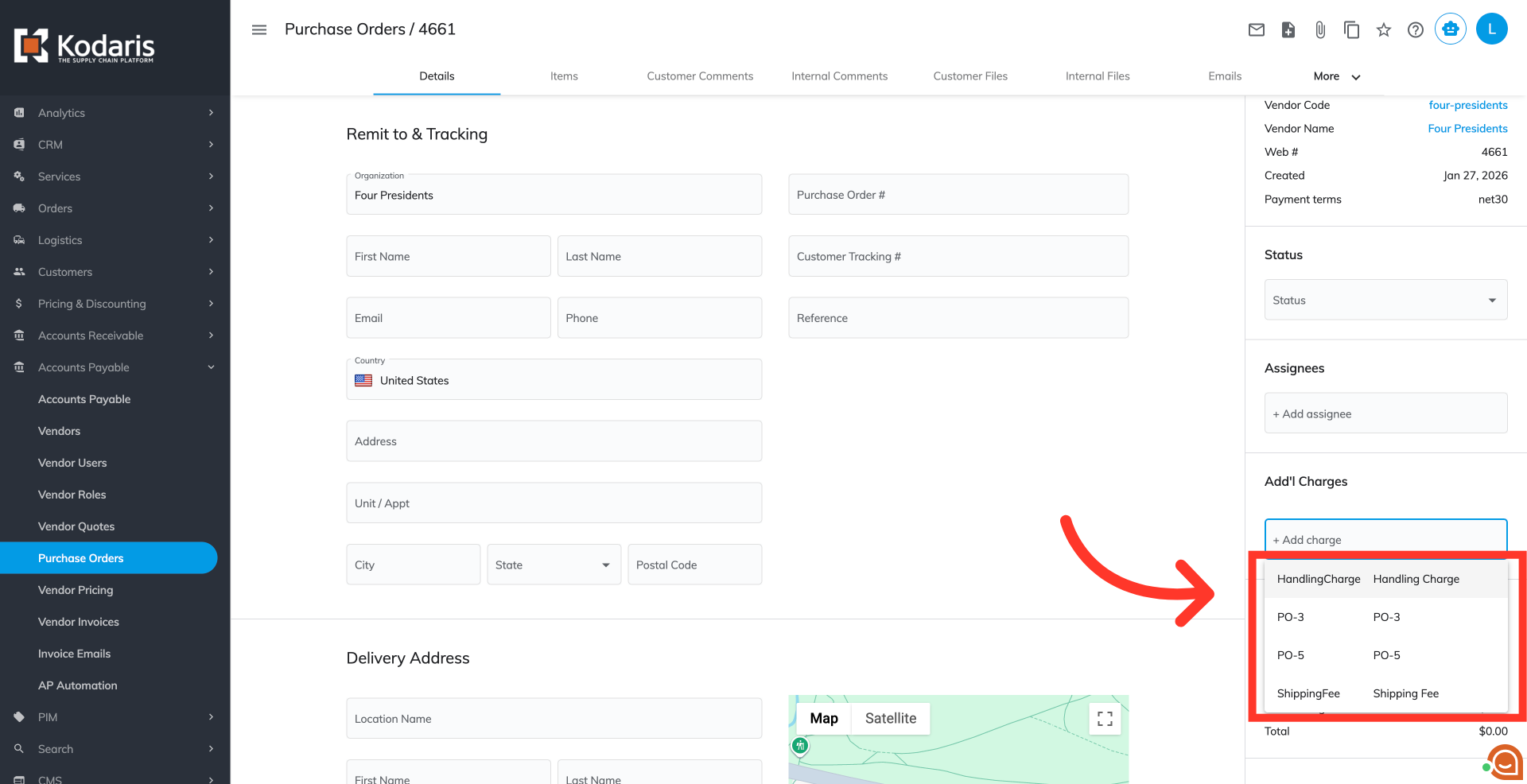 On the right side of the details, you will see the "Add'l Charges" section. It displays all additional charges of the purchase order. Click the "+Additional charge" field to view the available options.