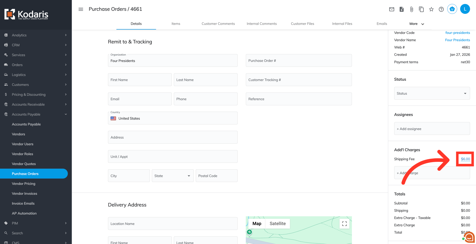 You can view and update "Additional Charges" on an existing or new Vendor Purchase Order. To view or update an existing one, navigate to "Purchase Orders" and view the additional charges on an order. To view and update on a new one, click the "Start Purchase Order" icon in the grid.