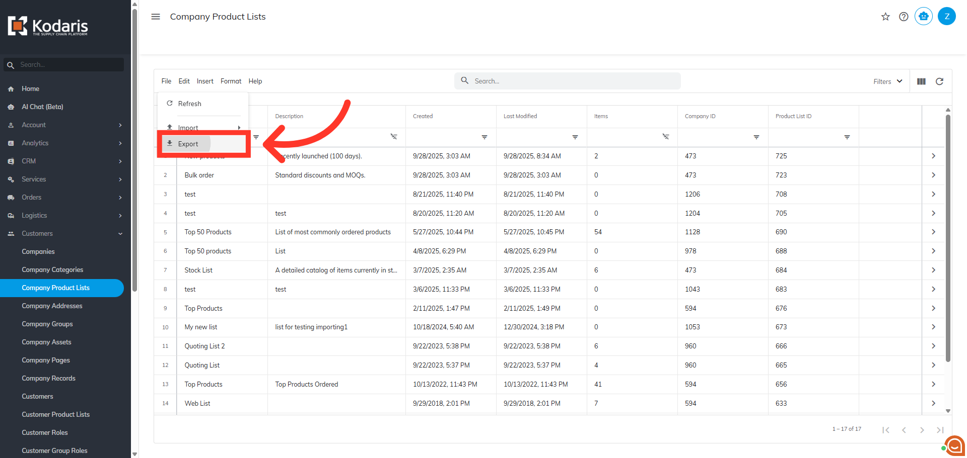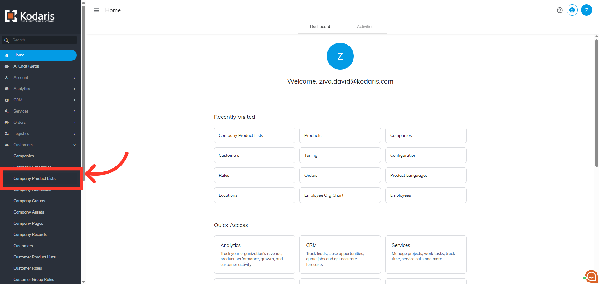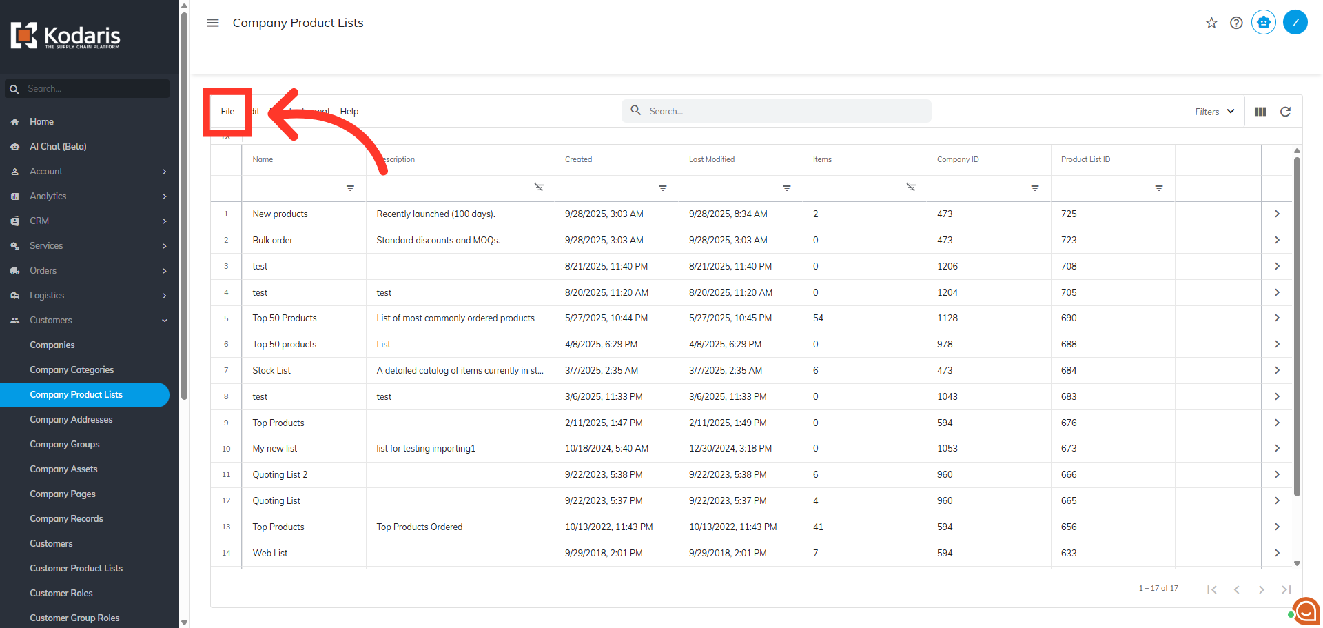 Then, click "Company Product Lists". In order to access and update “Company Product Lists” you will need to be set up either as an “administrator” or a “superuser”, or have the roles of: “companyWishListView” and “companyWishListEdit”.