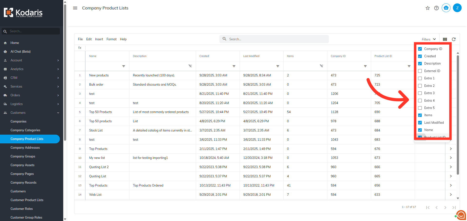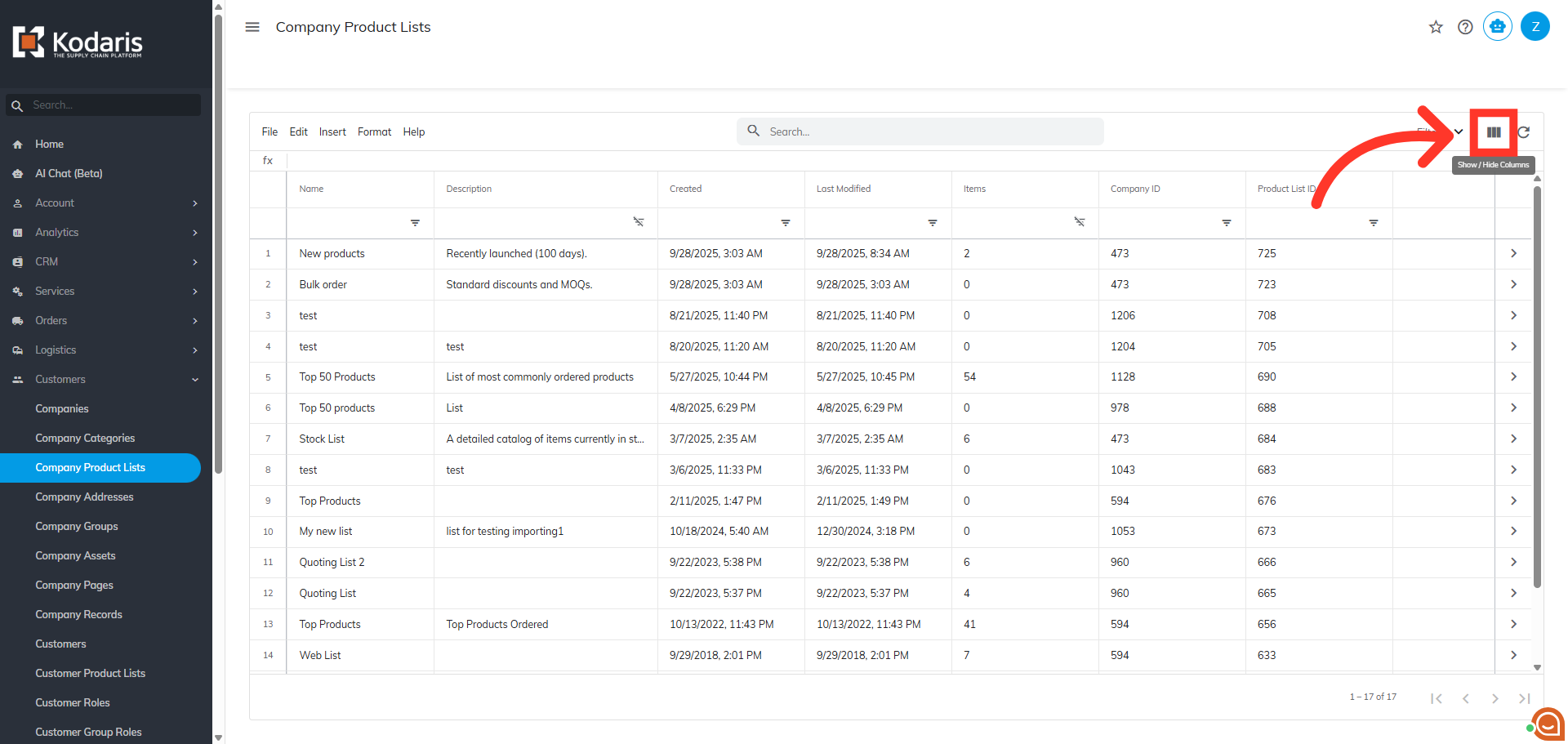 Click the "Show/Hide Columns" icon to customize which columns are displayed.