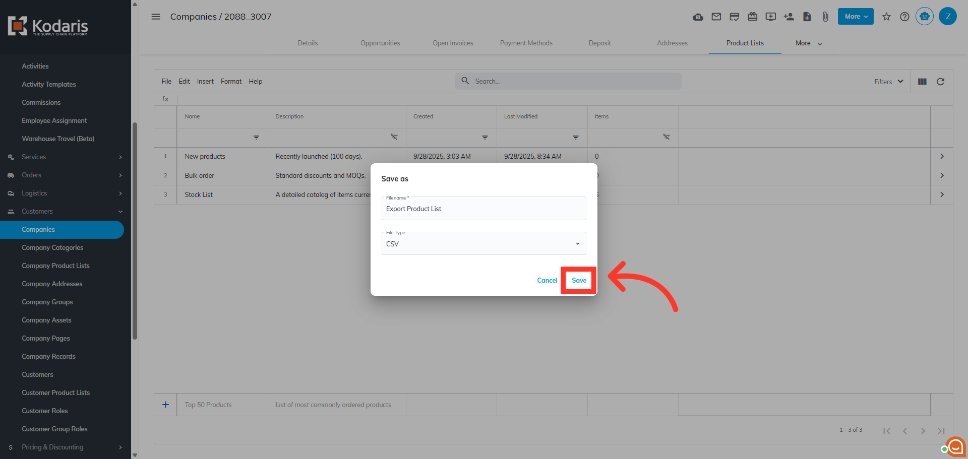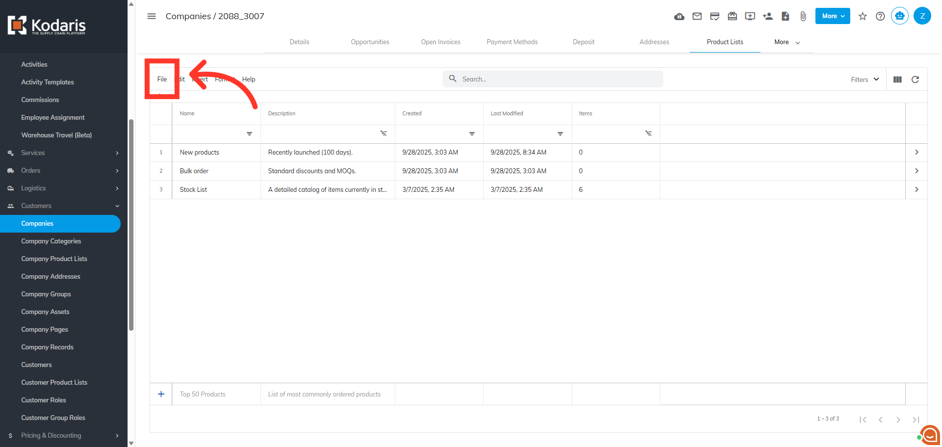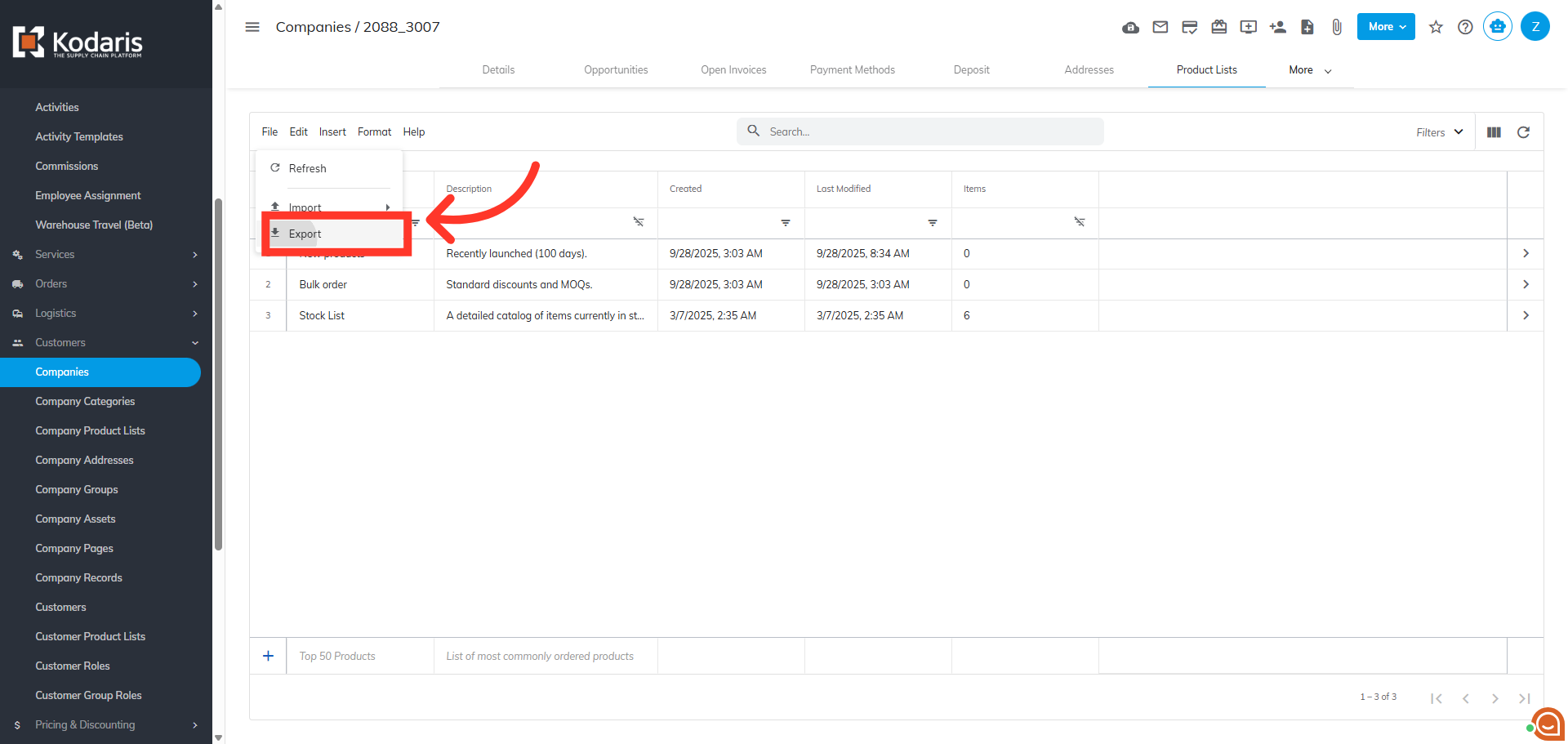 To export Product Lists that are assigned to a specific company, first, navigate to the "Customers" section in the Operations Portal.