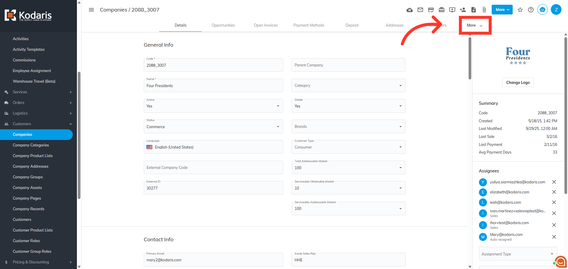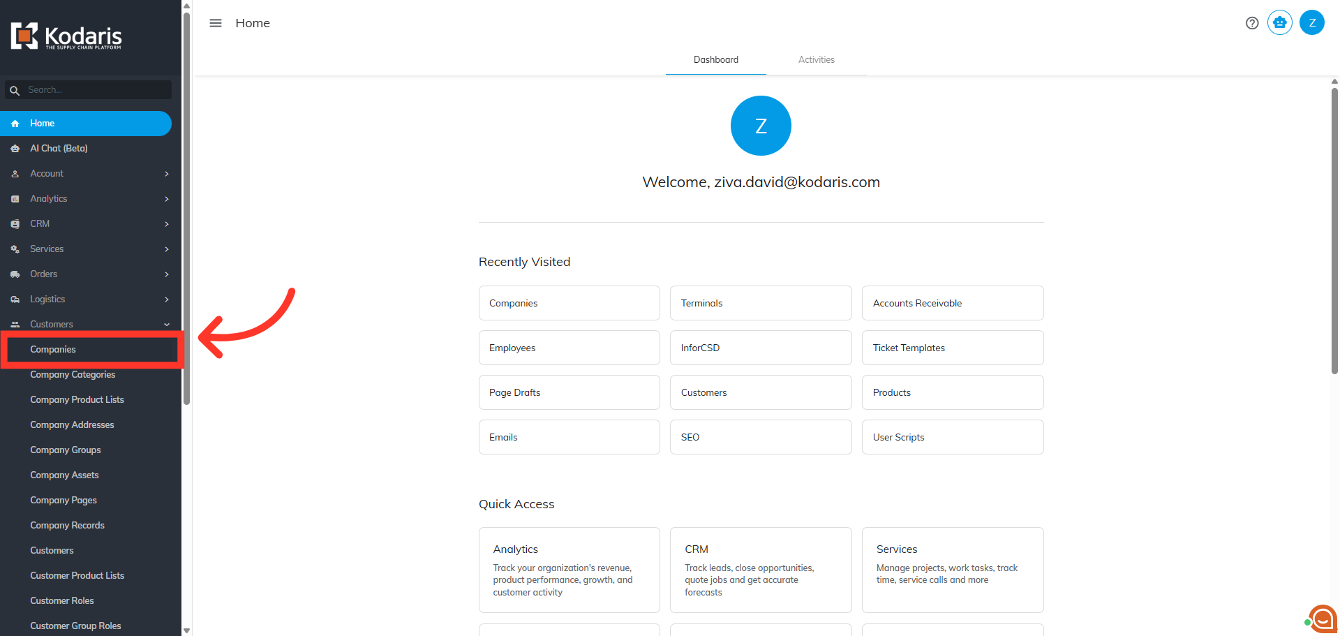 Then, click "Companies". In order to access "Companies" you will need to be set up either as an "administrator" or a "superuser", or have the appropriate roles: "companyView", "companyEdit", "customerView", and "customerEdit".