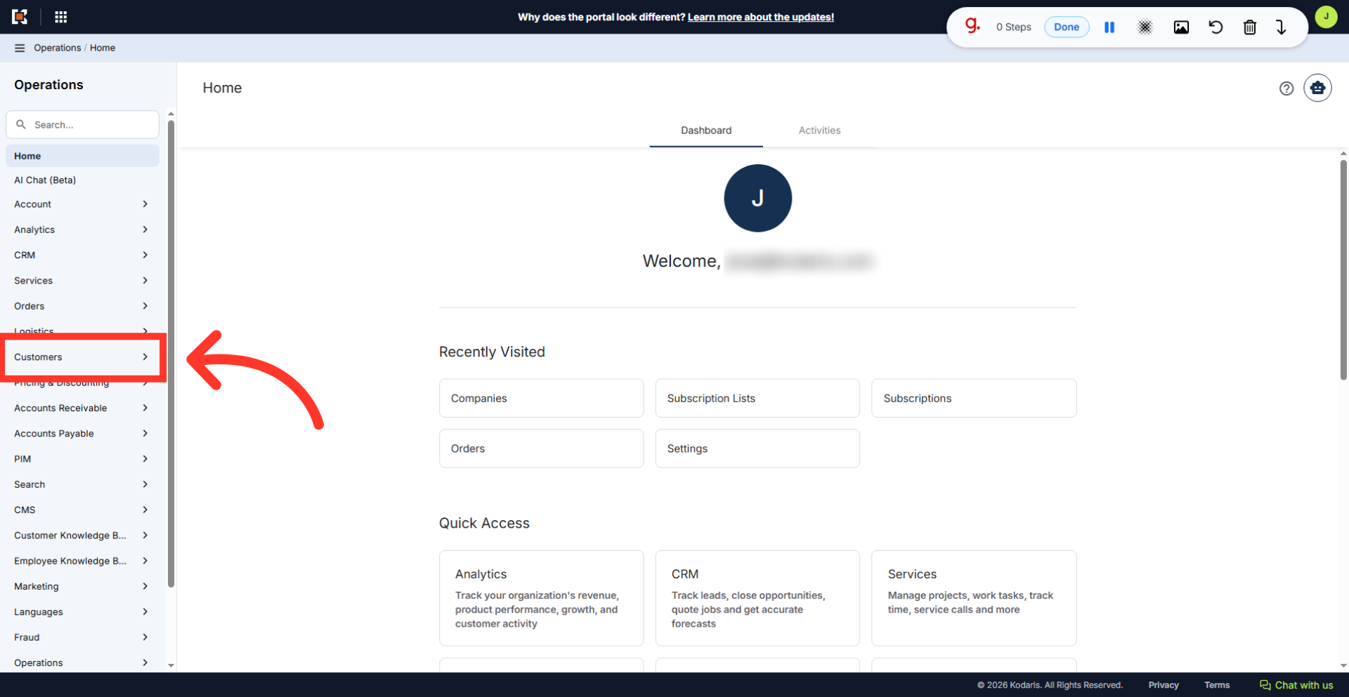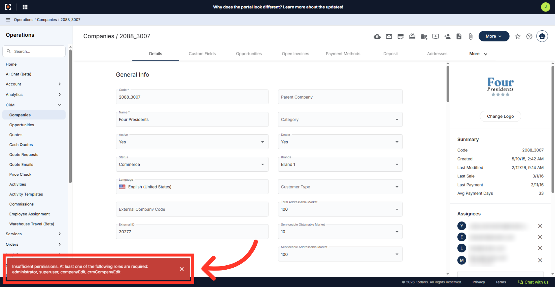 If users are trying to access an area in the operations portal and do not have the needed access a "Required Roles" alert will show on the screen. To see an example of this alert, we will navigate to the "Customers" section in the Operations Portal.