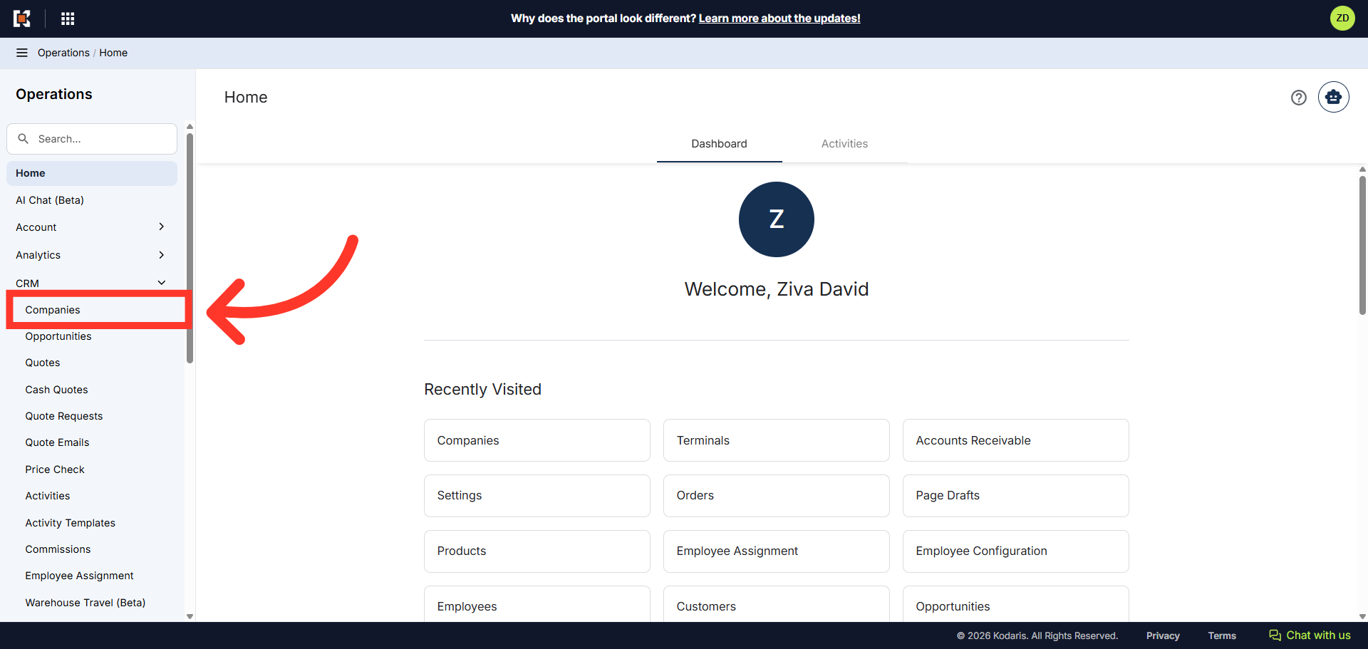 Then, click "Companies". In order to access "Companies" you will need to be set up either as an "administrator" or a "superuser", or have the appropriate roles: "companyEdit", or "crmCompanyEdit". Just a reminder, "crmCompanyEdit" access only allows employees to access companies that are assigned to them.