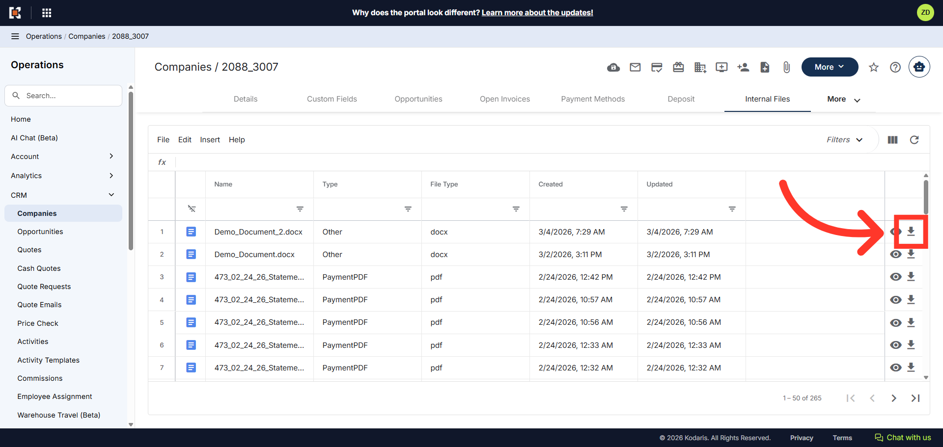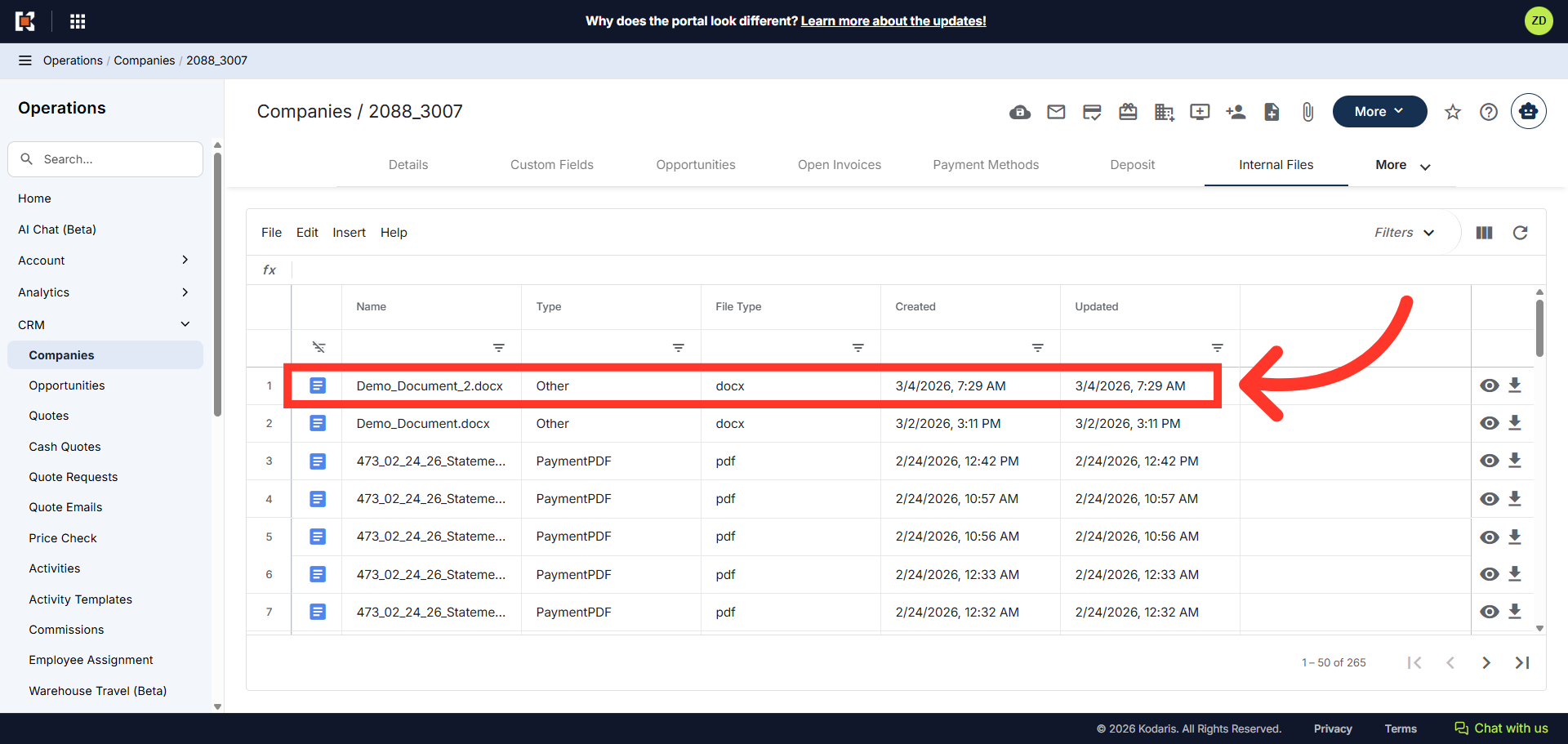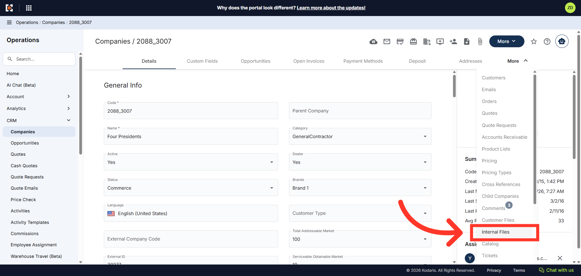 Internal Files are for operations portal users only. This is an excellent way to store files associated with a company that need to remain internal to your organization. You can upload and view these documents on a customers account by navigating to the "CRM" section in the Operations Portal.