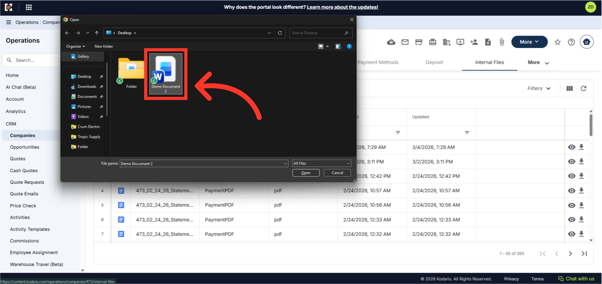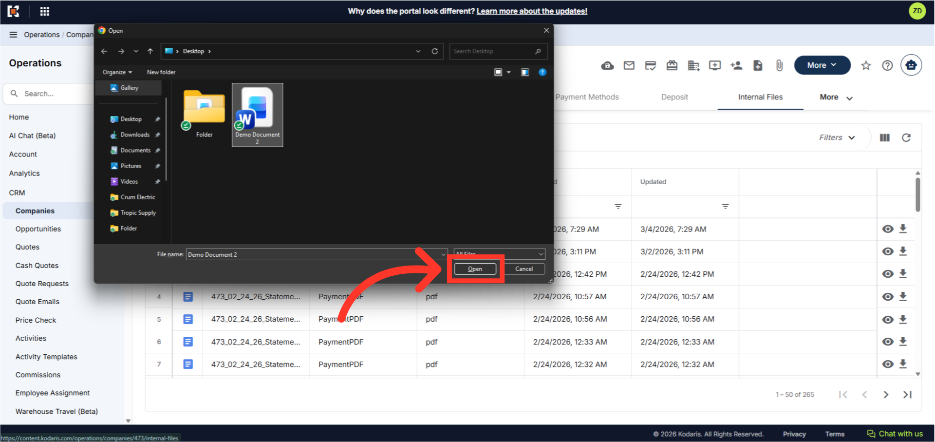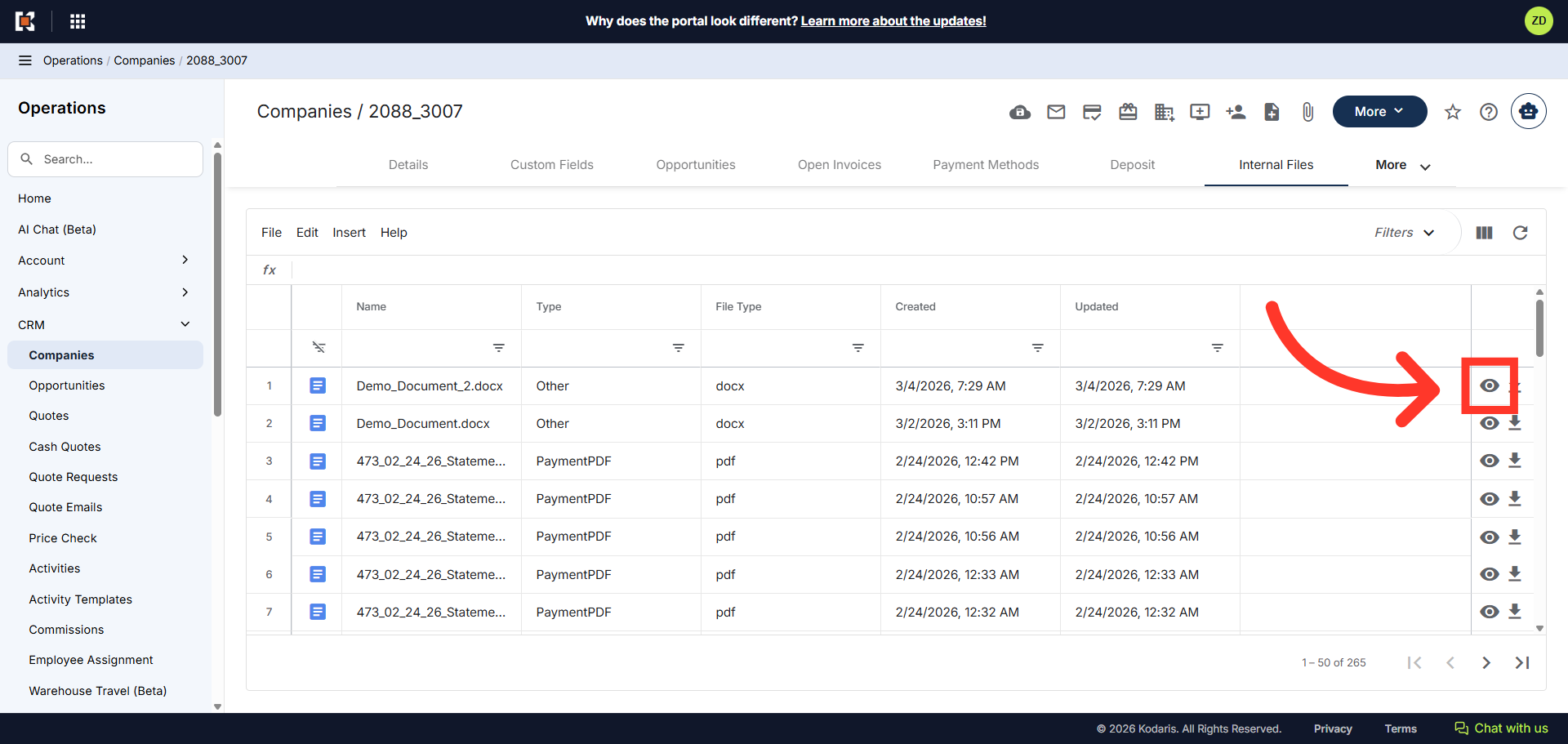 Internal Files are for operations portal users only. This is an excellent way to store files associated with a company that need to remain internal to your organization. You can upload and view these documents on a customers account by navigating to the "CRM" section in the Operations Portal.