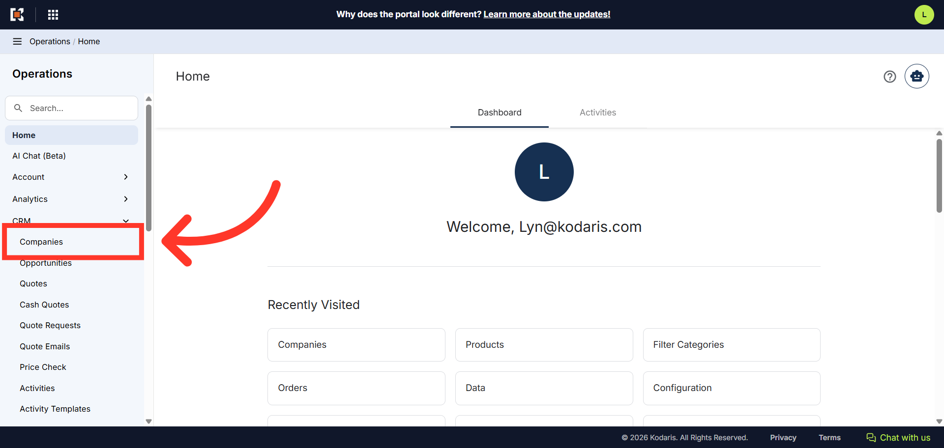 Then, click "Companies". In order to access "Companies", you will need to be set up either as an "administrator" or a "superuser", or have the appropriate roles: "companyEdit", or "crmCompanyEdit". Just a reminder, "crmCompanyEdit" access only allows employees to access companies that are assigned to them.
