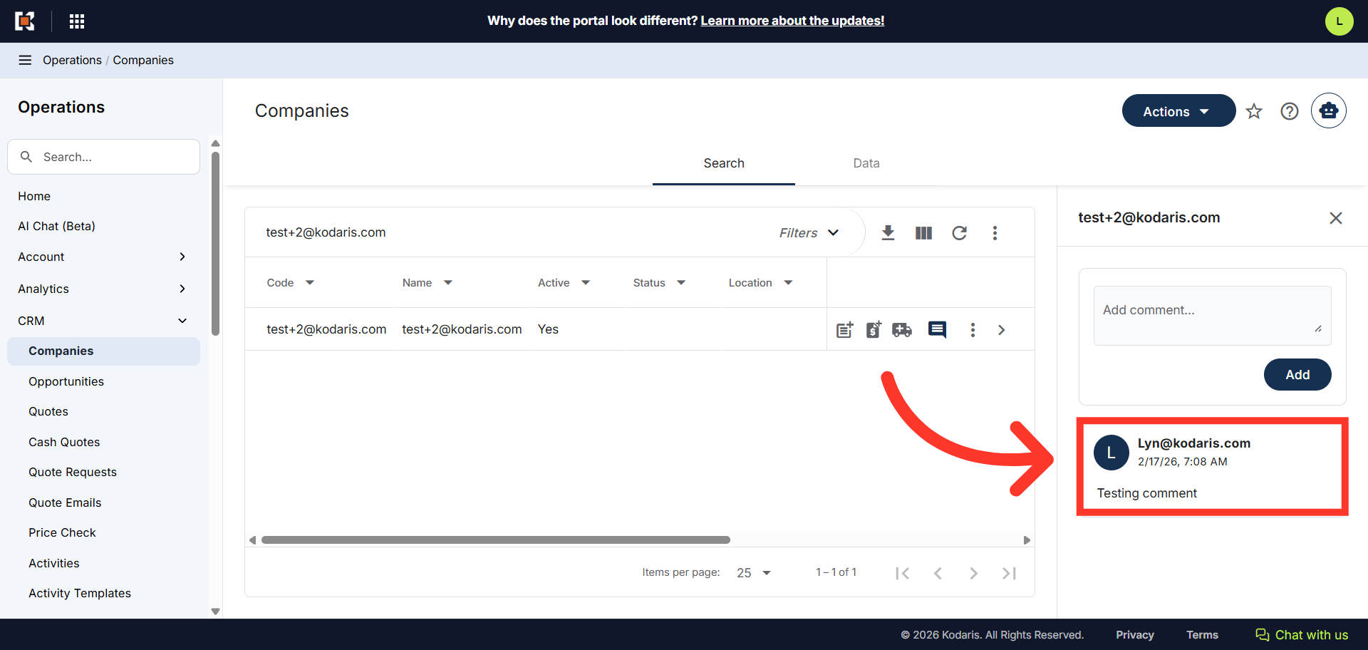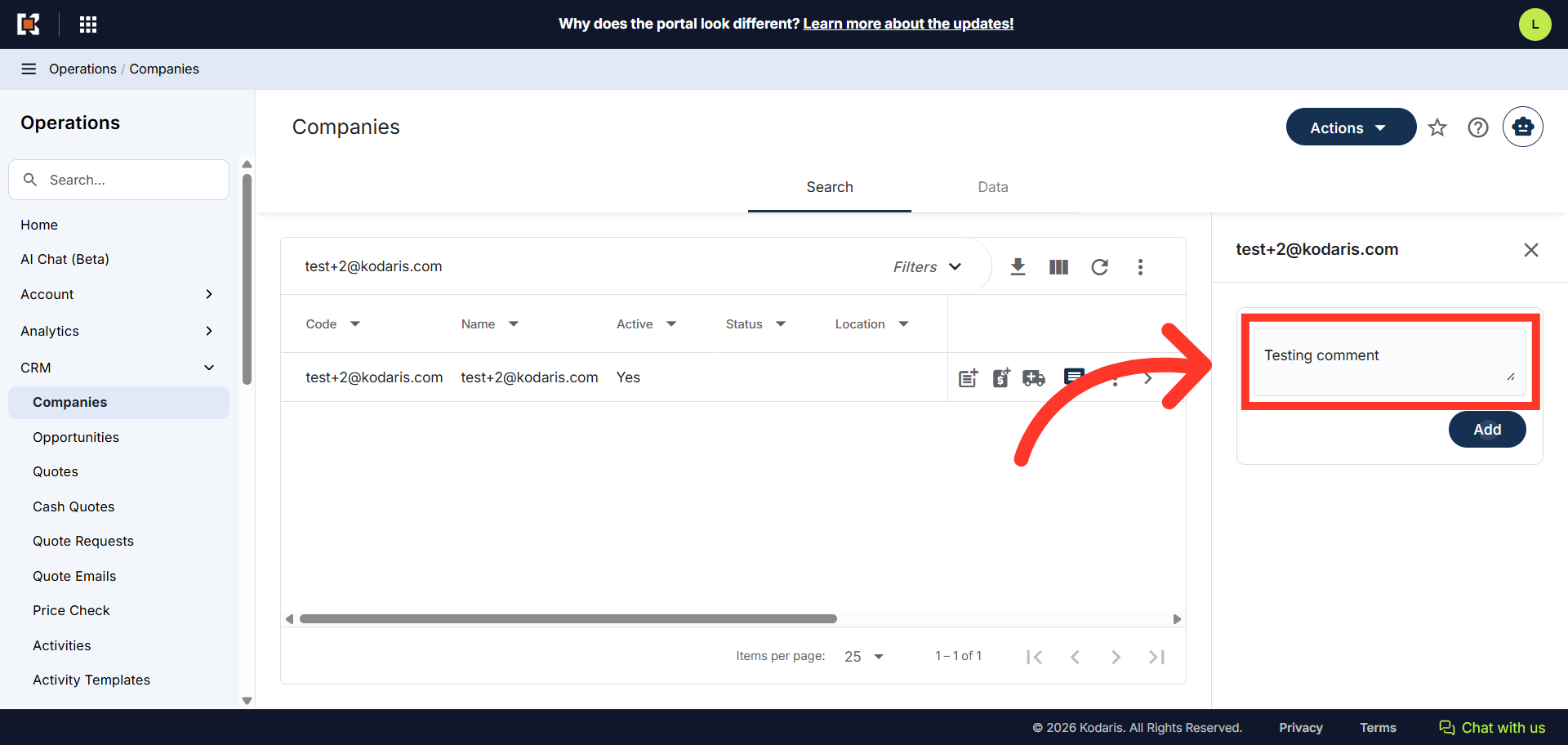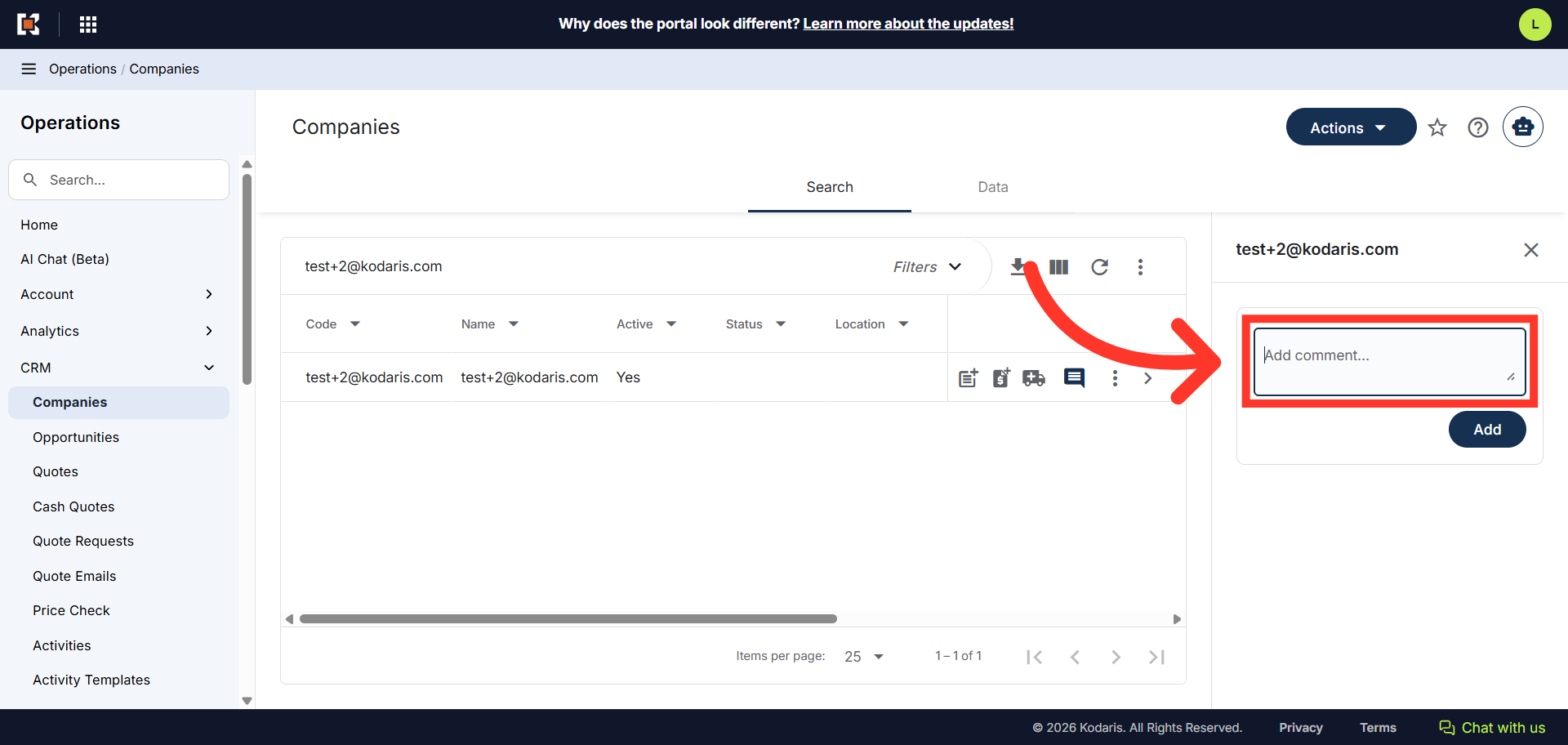 The CRM functionality allows you to add internal comments to companies directly from the search grid interface. These comments are visible only to employees and are useful for CRM purposes and internal collaboration about customers. To start, navigate to "CRM" section in the Operations Portal.