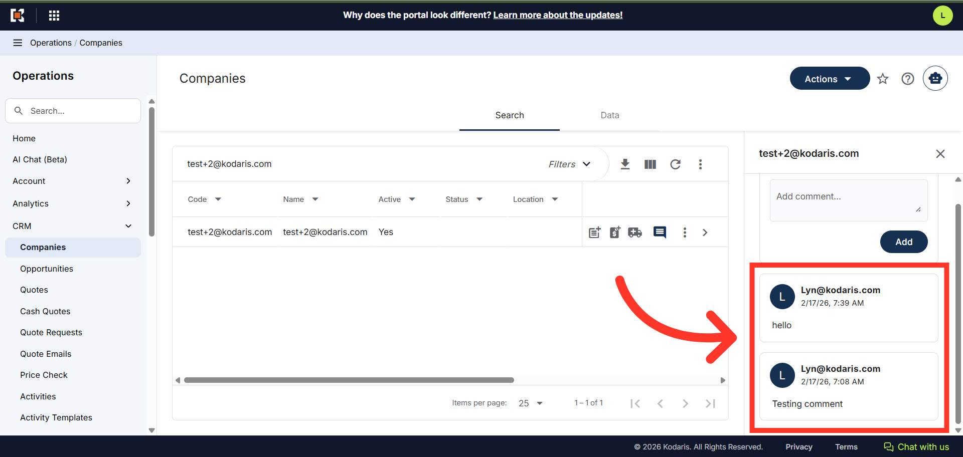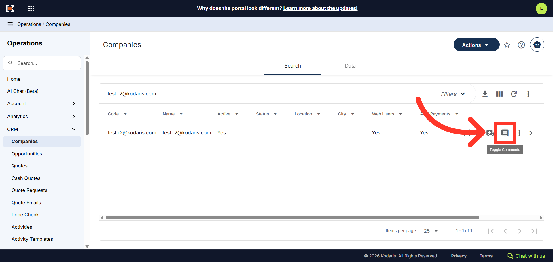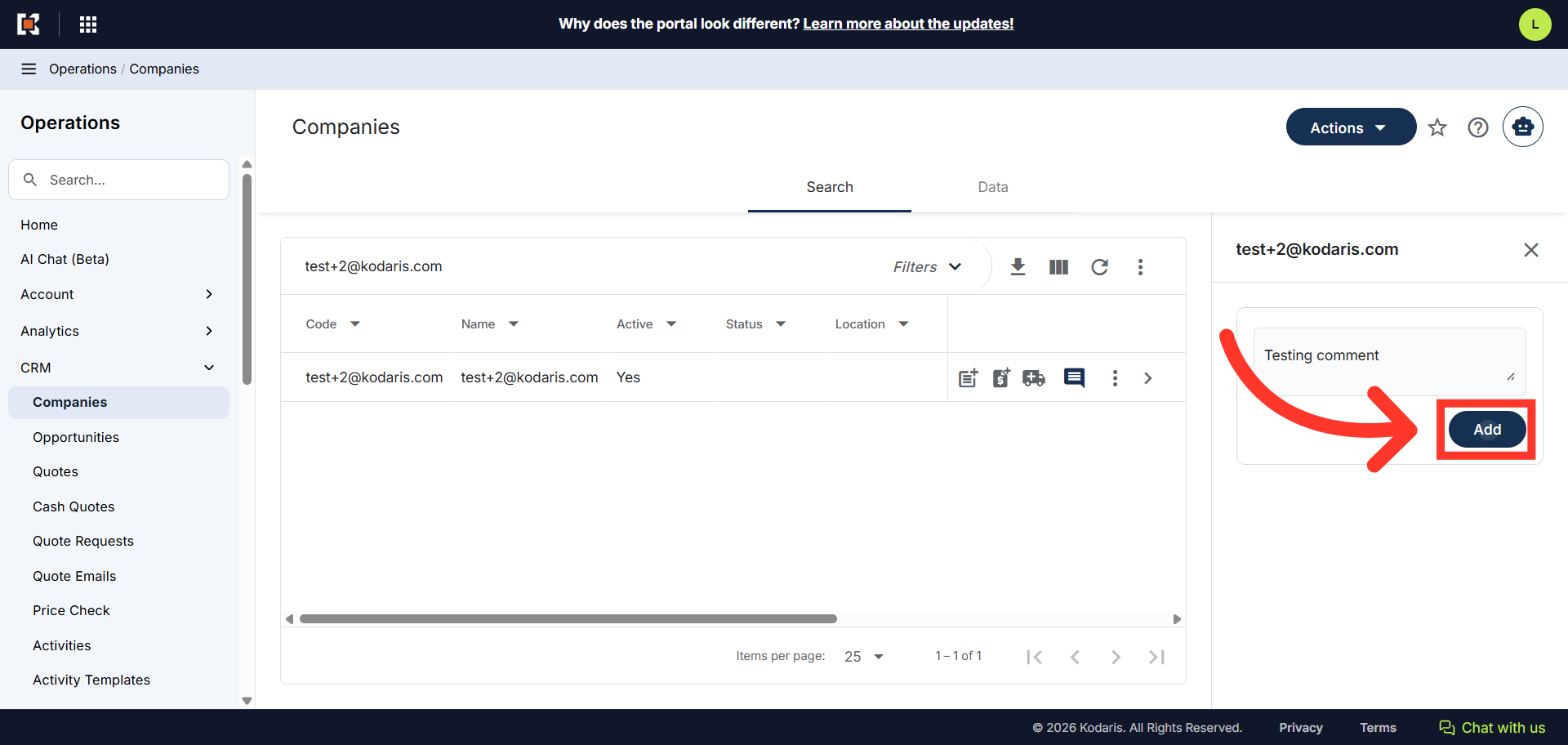 The CRM functionality allows you to add internal comments to companies directly from the search grid interface. These comments are visible only to employees and are useful for CRM purposes and internal collaboration about customers. To start, navigate to "CRM" section in the Operations Portal.