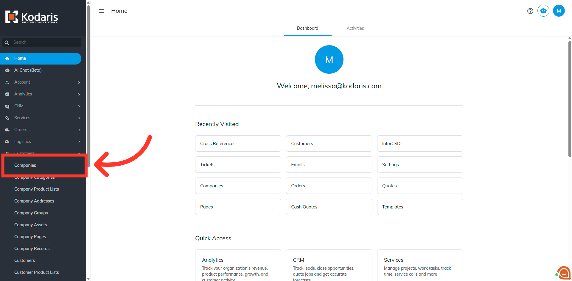 Then, click "Companies". In order to access "Companies" you will need to be set up either as an "administrator" or a "superuser", or have the appropriate roles: "companyView and companyEdit", or "crmCompanyView and crmCompanyEdit". Just a reminder, "crmCompanyView and crmCompanyEdit" access only allows employees to view companies that are assigned to them.