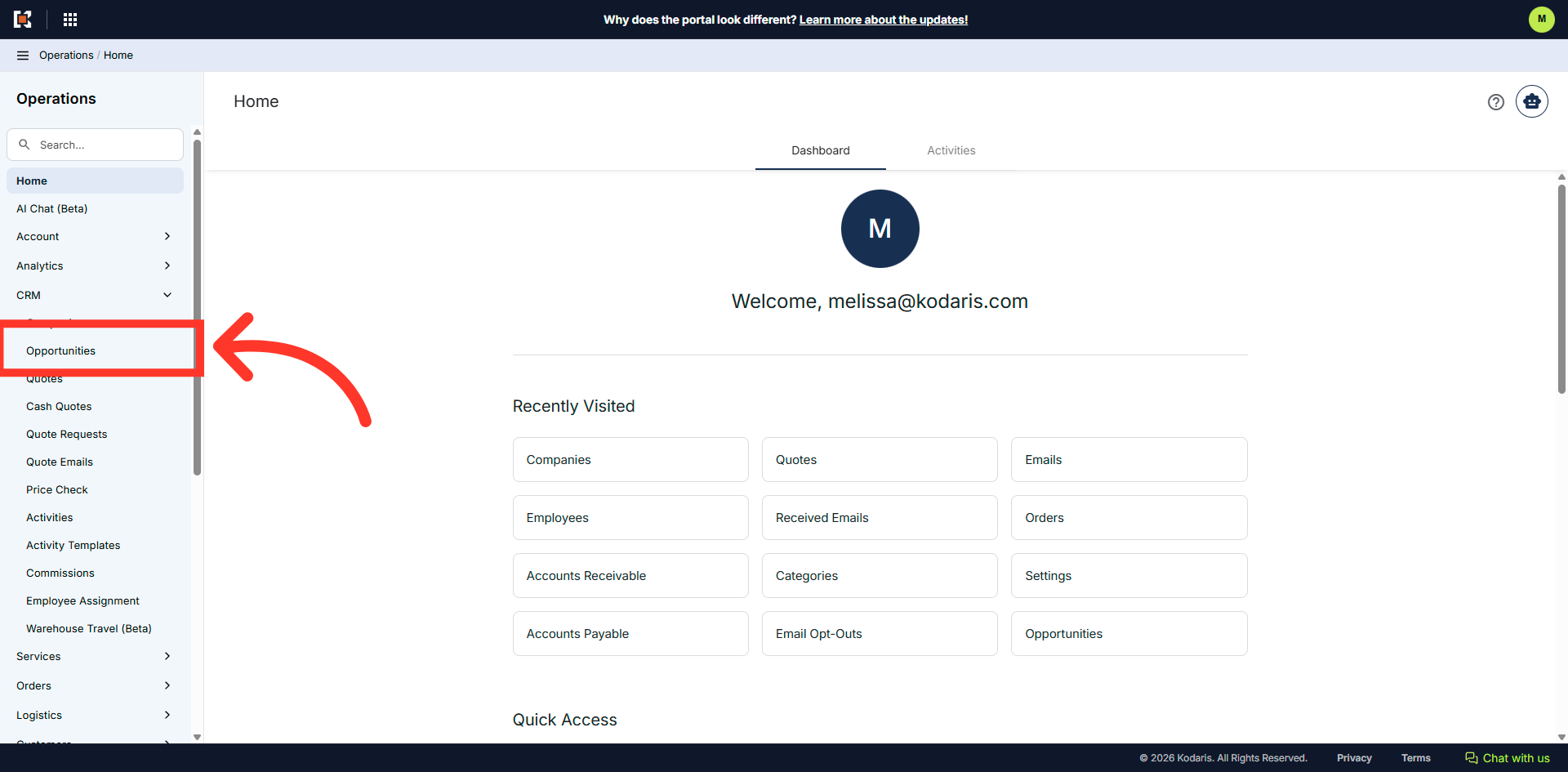 Then, click "Opportunities". In order to access and update "Opportunities" you will need to be set up either as an "administrator" or a "superuser", or have the roles of: "accountQuoting" and "dashboardSearch".