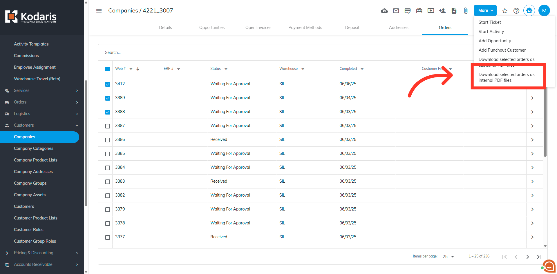 You can either select "Download selected orders as customer PDF files" or "Download selected orders as internal PDF files". For this example, we will select "Download selected orders as internal PDF files".