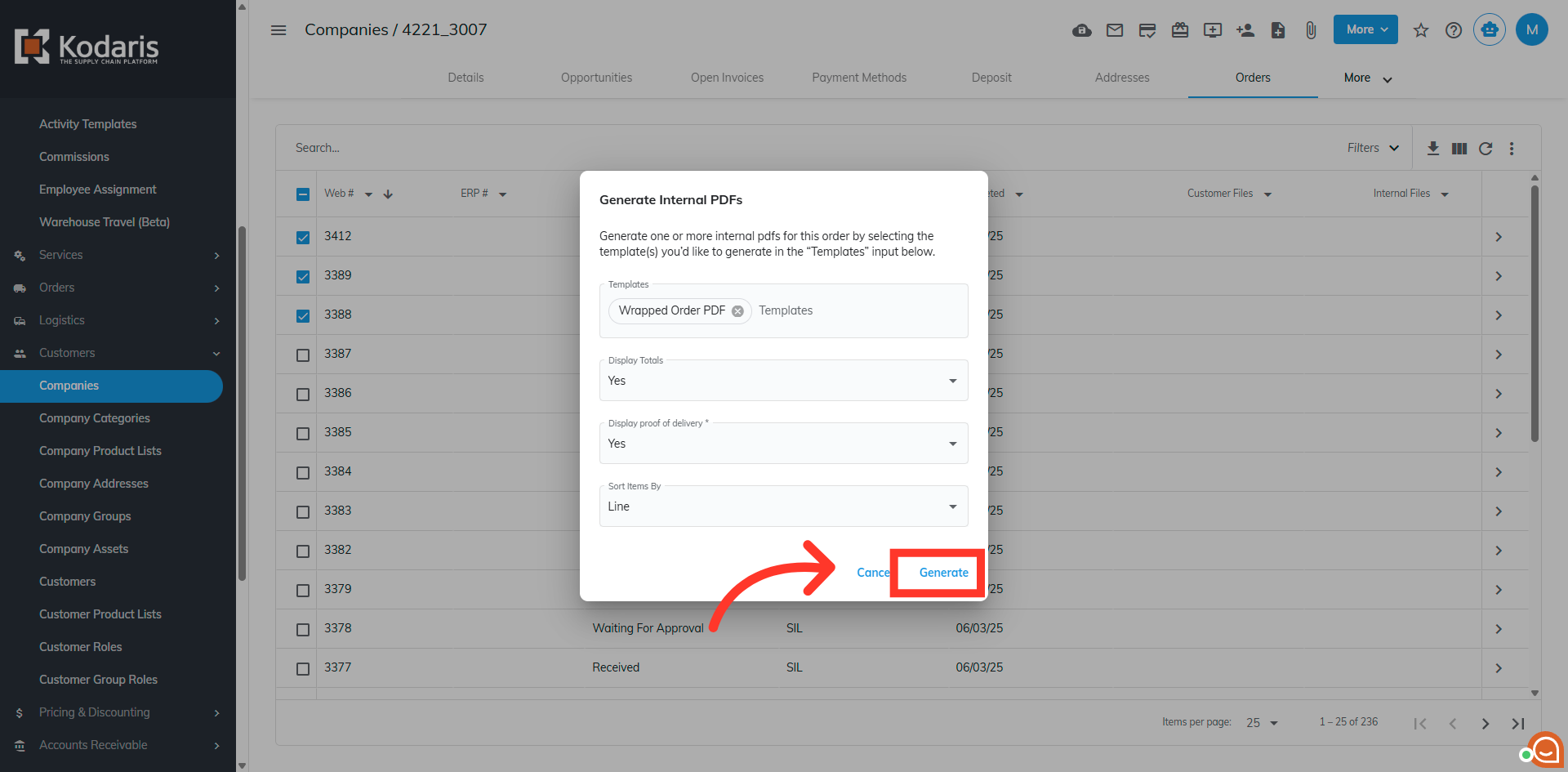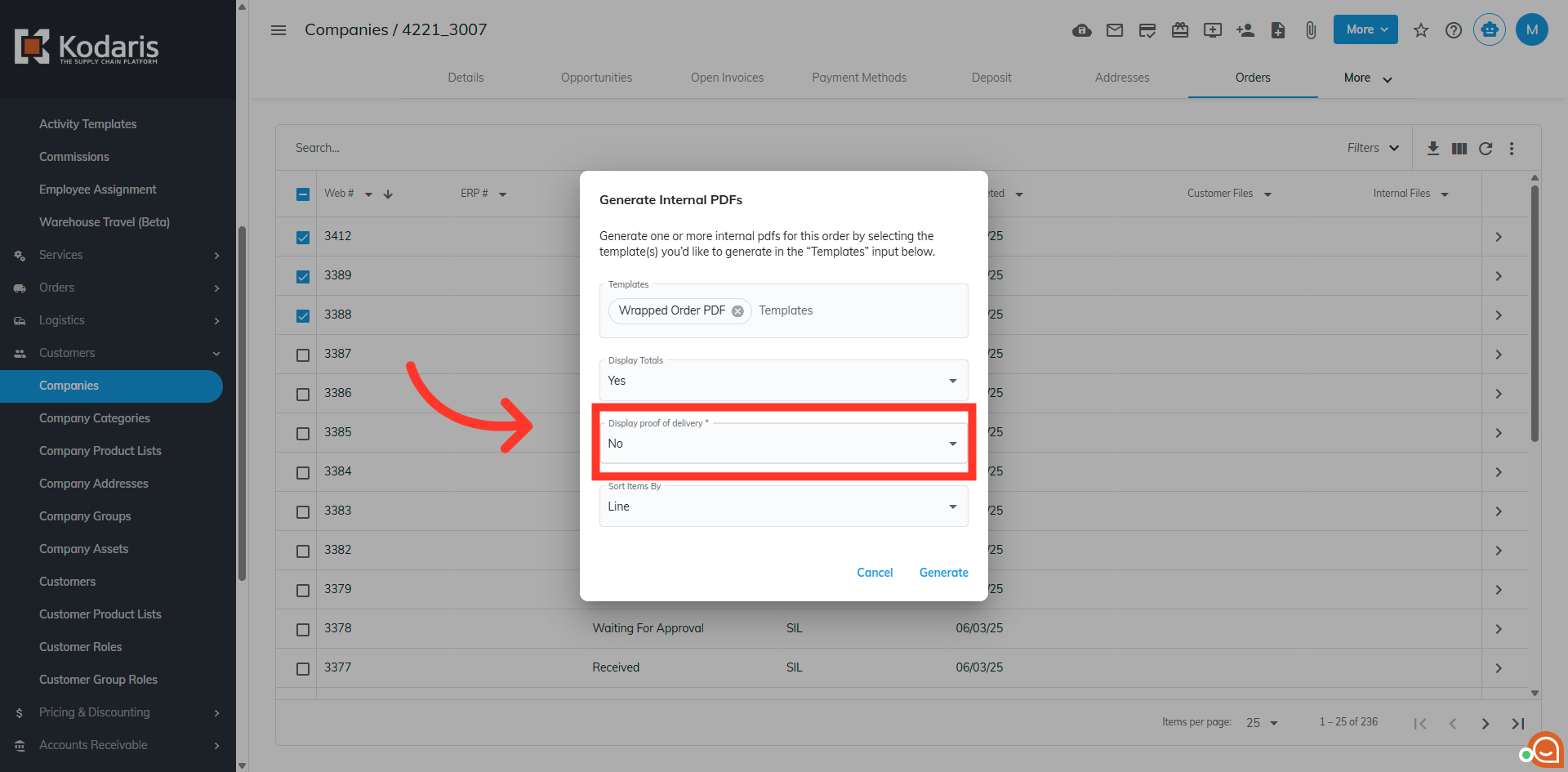 Select all the orders that you want to generate a proof of delivery for by clicking the checkbox.
