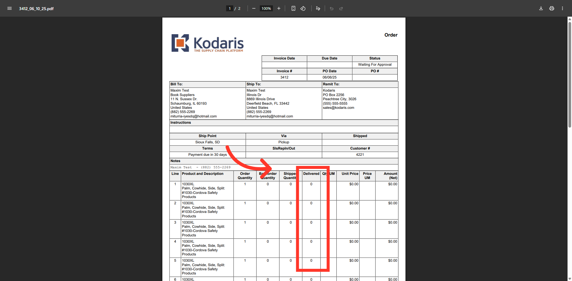Check that the "Delivered" column will be displayed in the downloaded PDFs.
