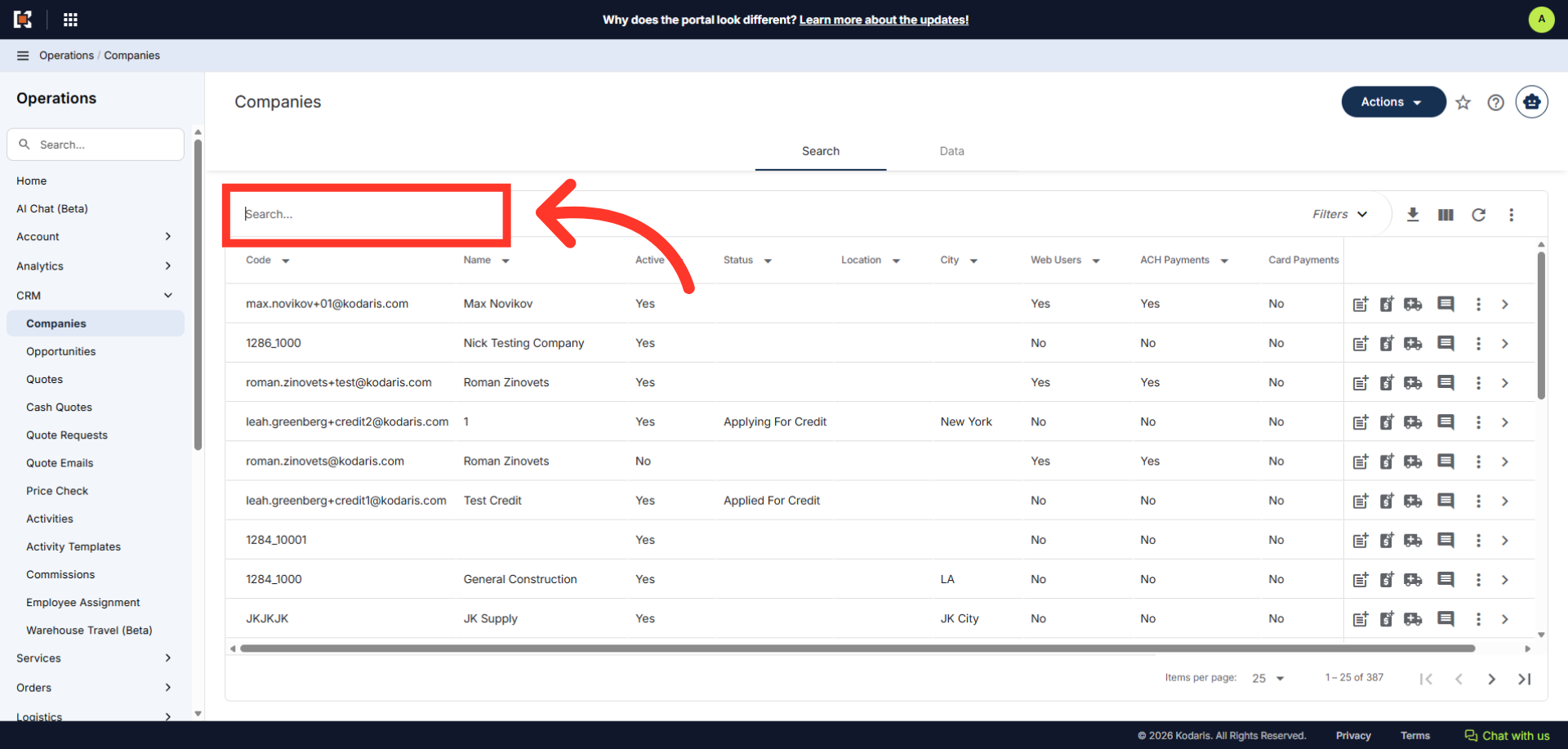 Then, click "Companies". In order to access "Companies", you will need to be set up either as an "administrator" or a "superuser", or have the appropriate roles: "companyView and companyEdit", or "crmCompanyView and crmCompanyEdit". Just a reminder, "crmCompanyView and crmCompanyEdit" access only allows employees to view companies that are assigned to them.