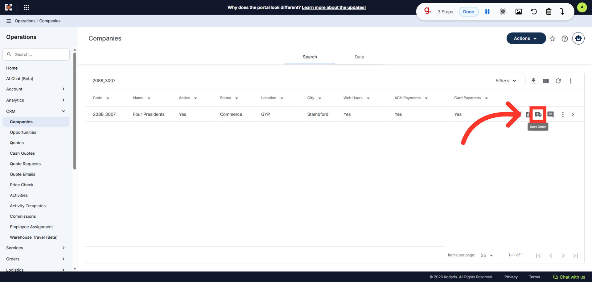 Click the "Start Order" Icon. In order to access and use this feature, you will need to be set up either as an "administrator" or a "superuser", or have the following roles: "orderEdit" or "crmCompanyOrderEdit". Just a reminder, "crmCompanyOrderEdit" only allows employees to start orders to companies that are assigned to them.