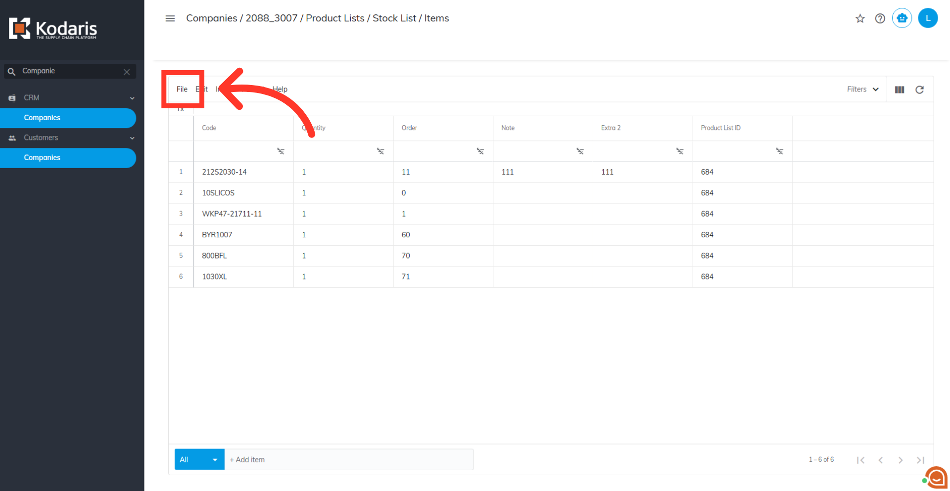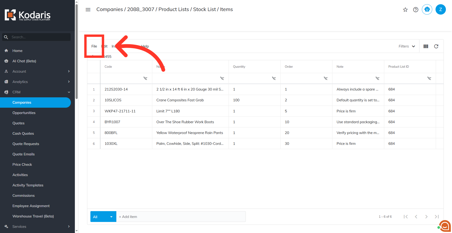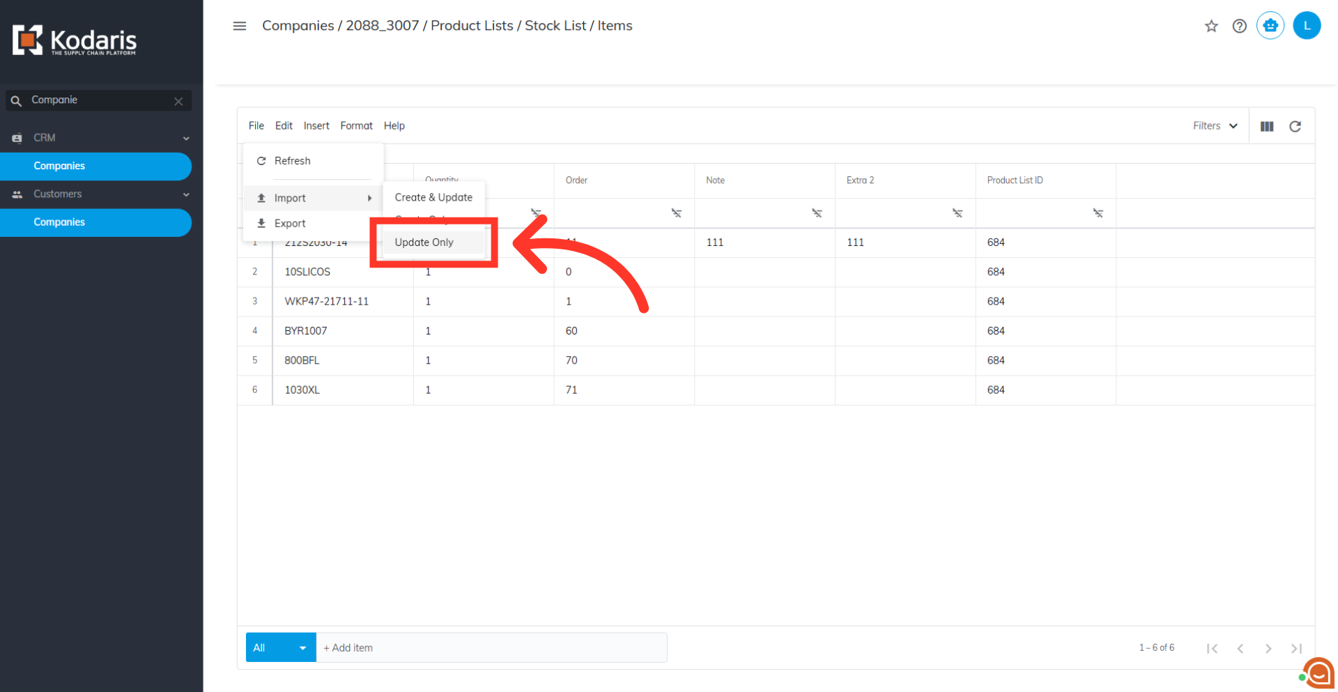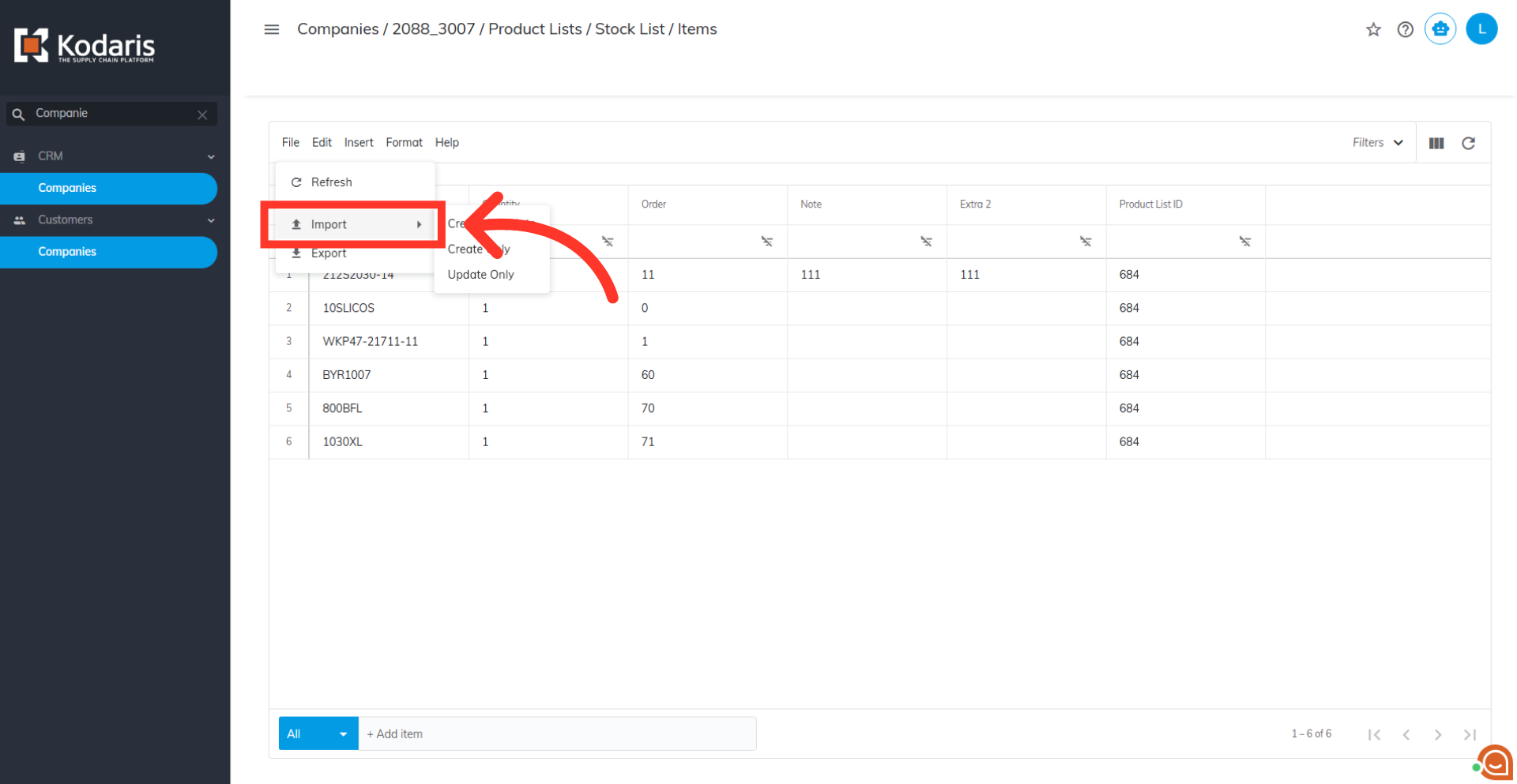 Users can update existing company product lists through CSV file imports. This bulk import method allows you to quickly update product lists rather than manually adding each product individually. To do this, navigate to the "CRM" section in the Operations Portal.