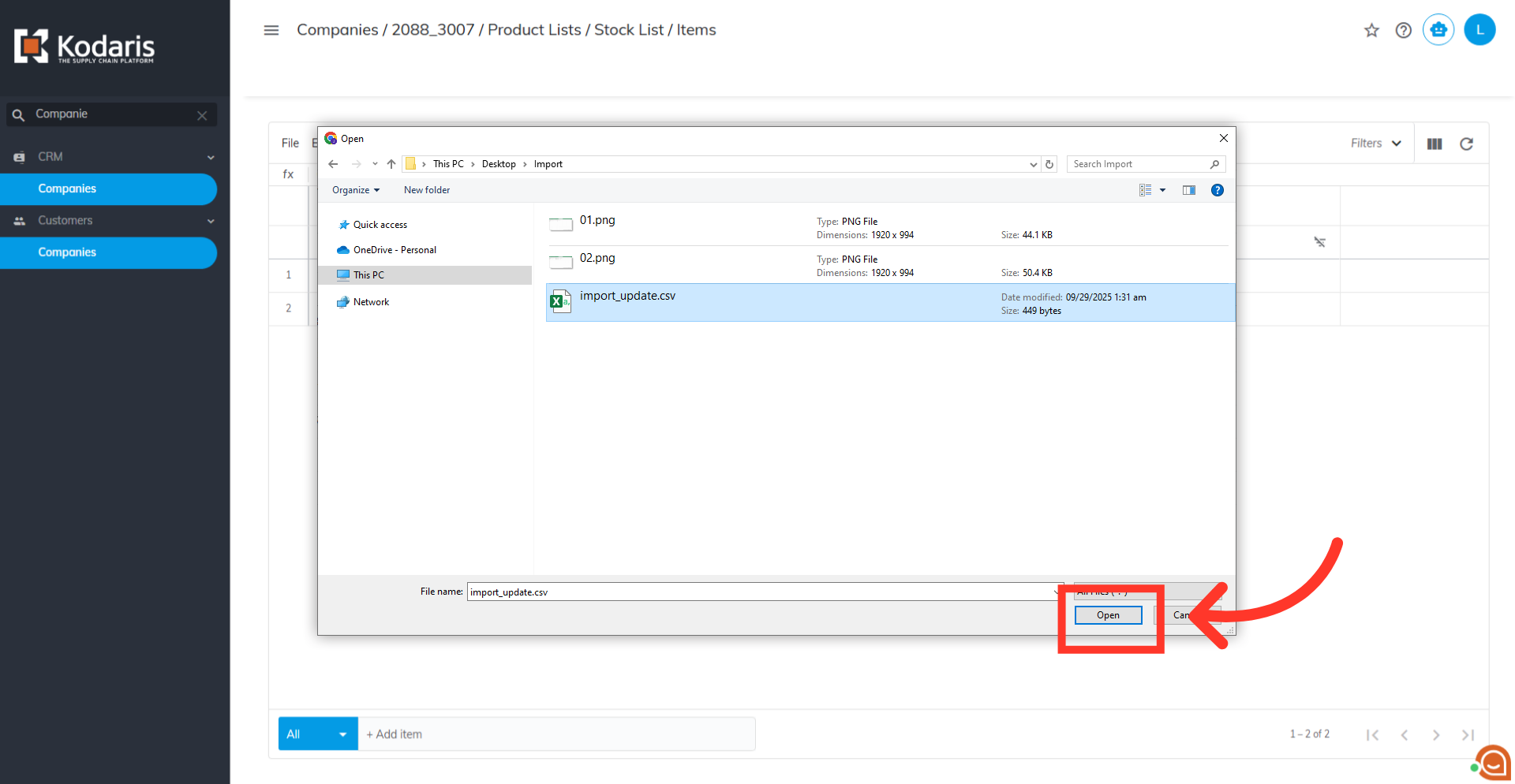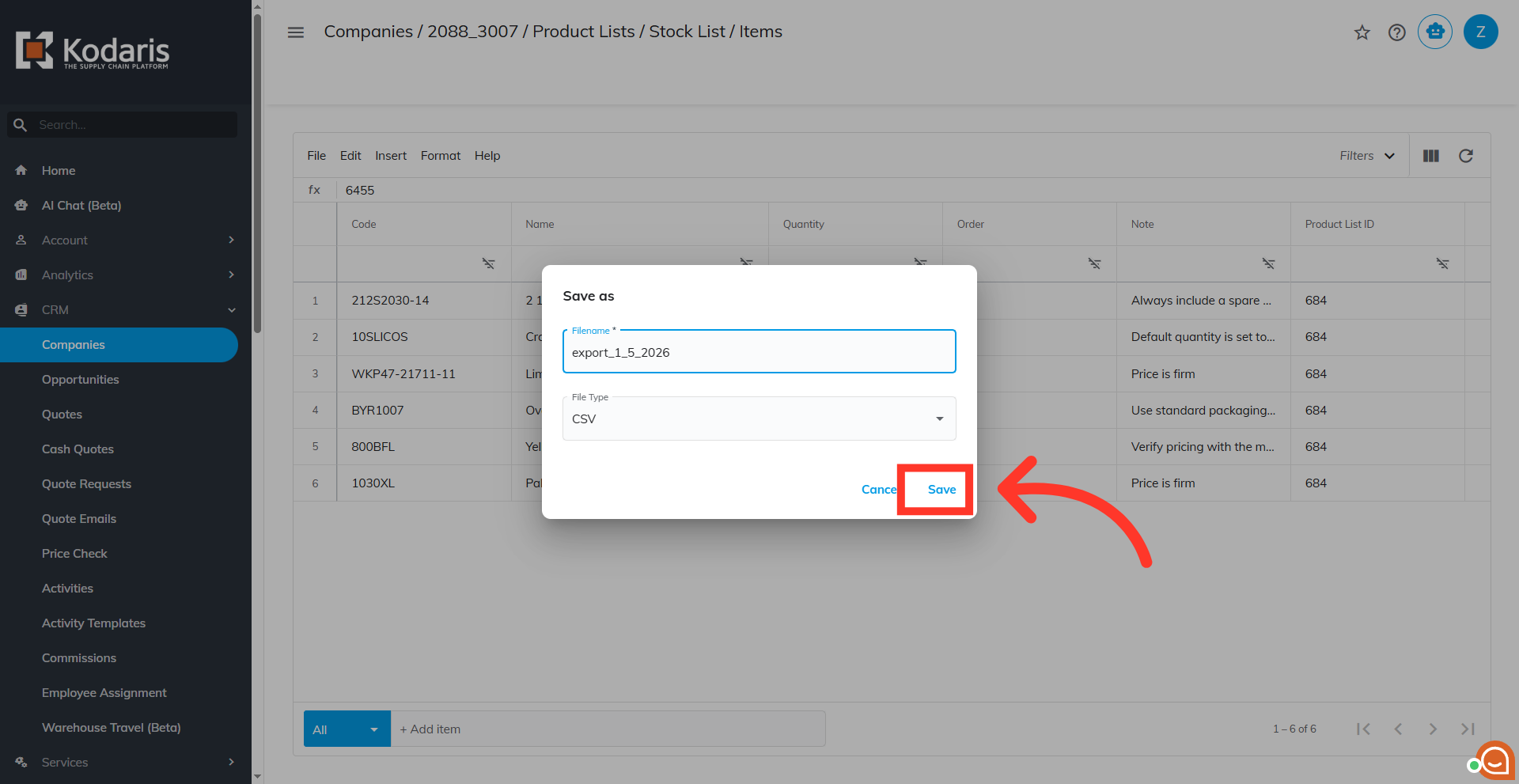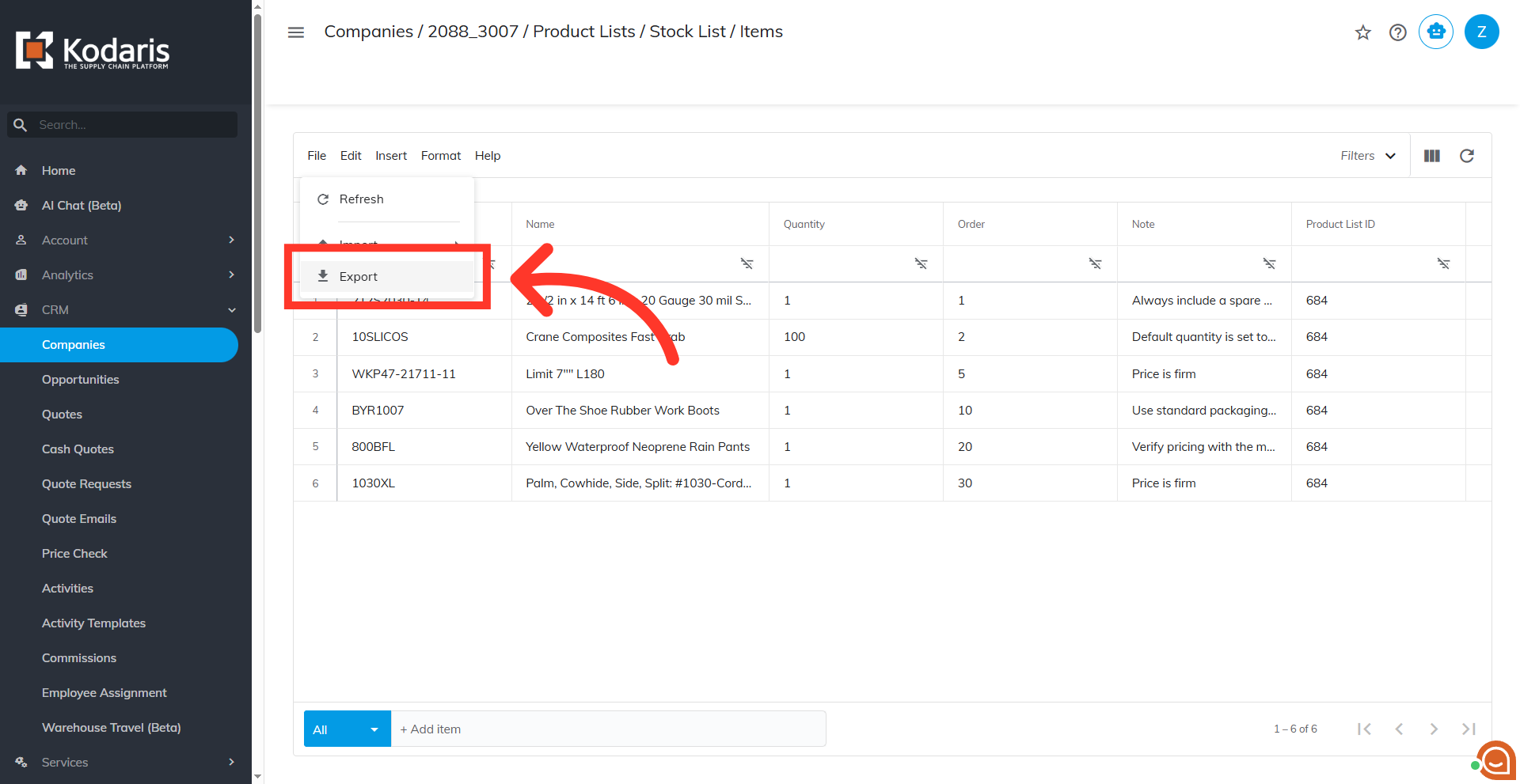 Users can update existing company product lists through CSV file imports. This bulk import method allows you to quickly update product lists rather than manually adding each product individually. To do this, navigate to the "CRM" section in the Operations Portal.