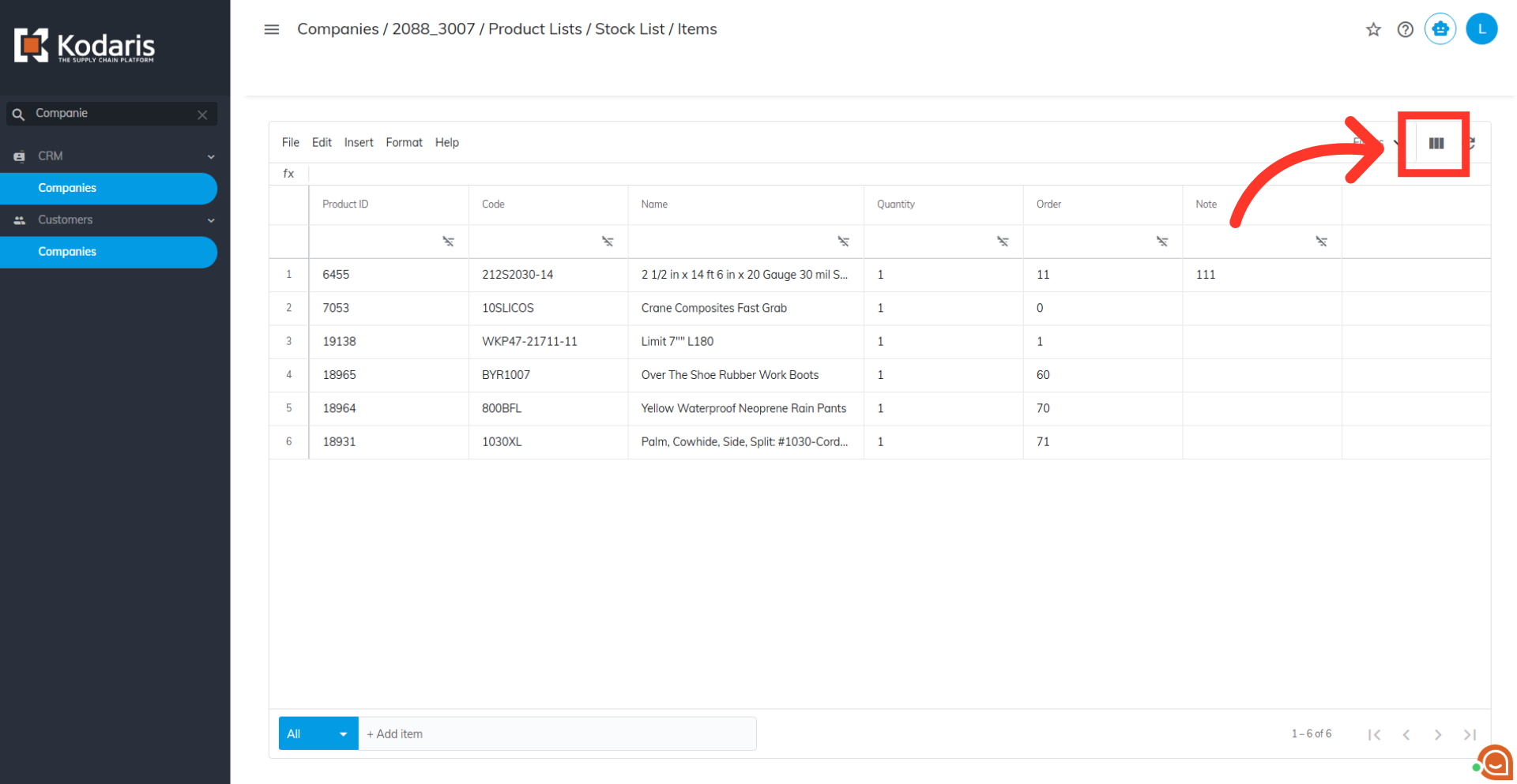 To export a file that can be used for importing data, the "Code" and "Product List ID" are required columns for importing and need to be added to the grid. You can also include other helpful columns such as "Quantity", "Order", and "Note". Uncheck any columns that are not needed to simplify the export file.