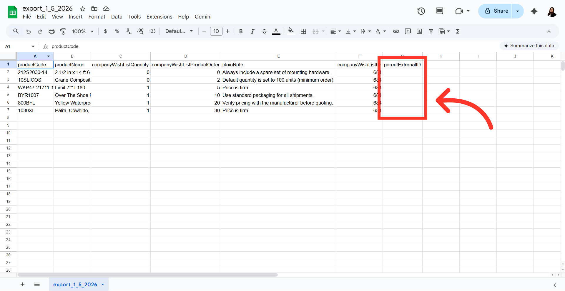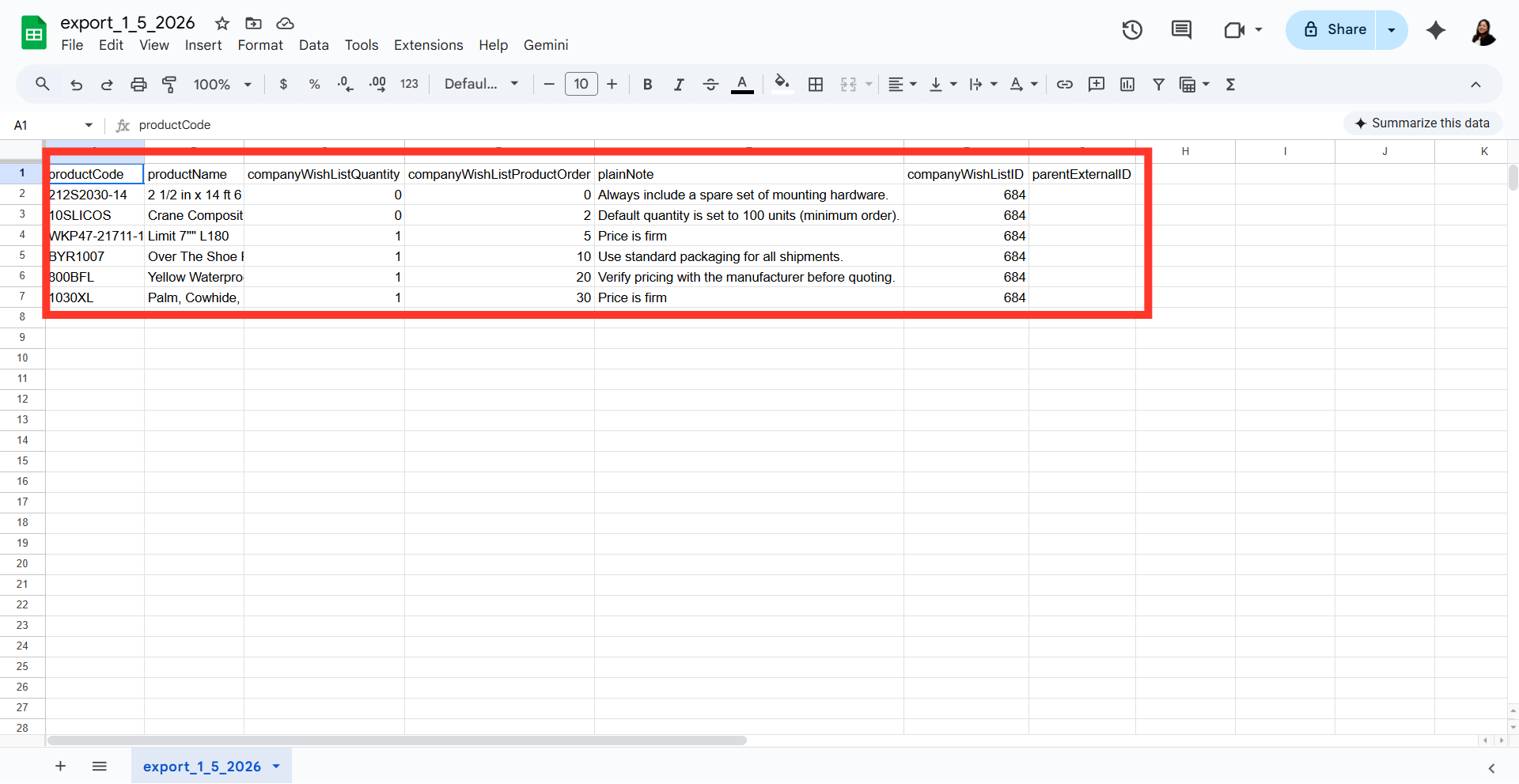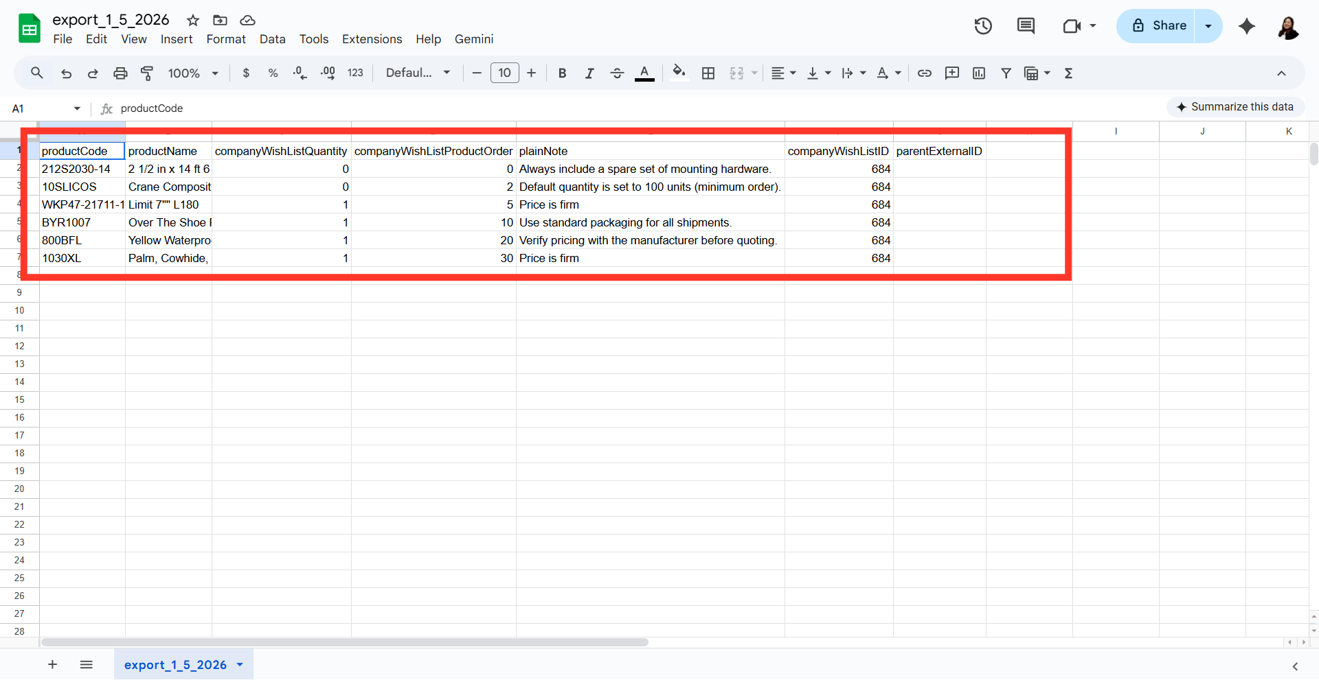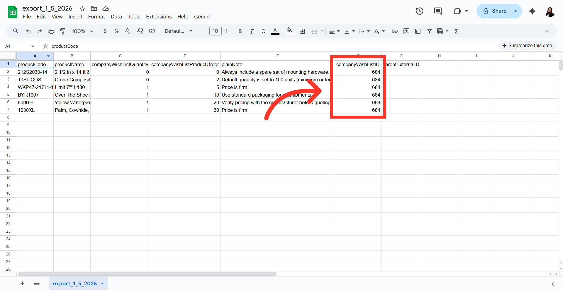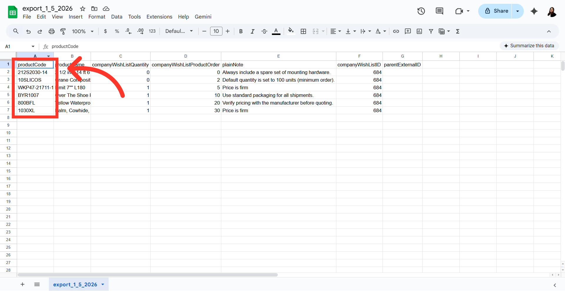 Here you can see an example export that includes the required columns "Code" and "Product List ID" along with any other columns chosen. Any data included with the export will also be in the spreadsheet.