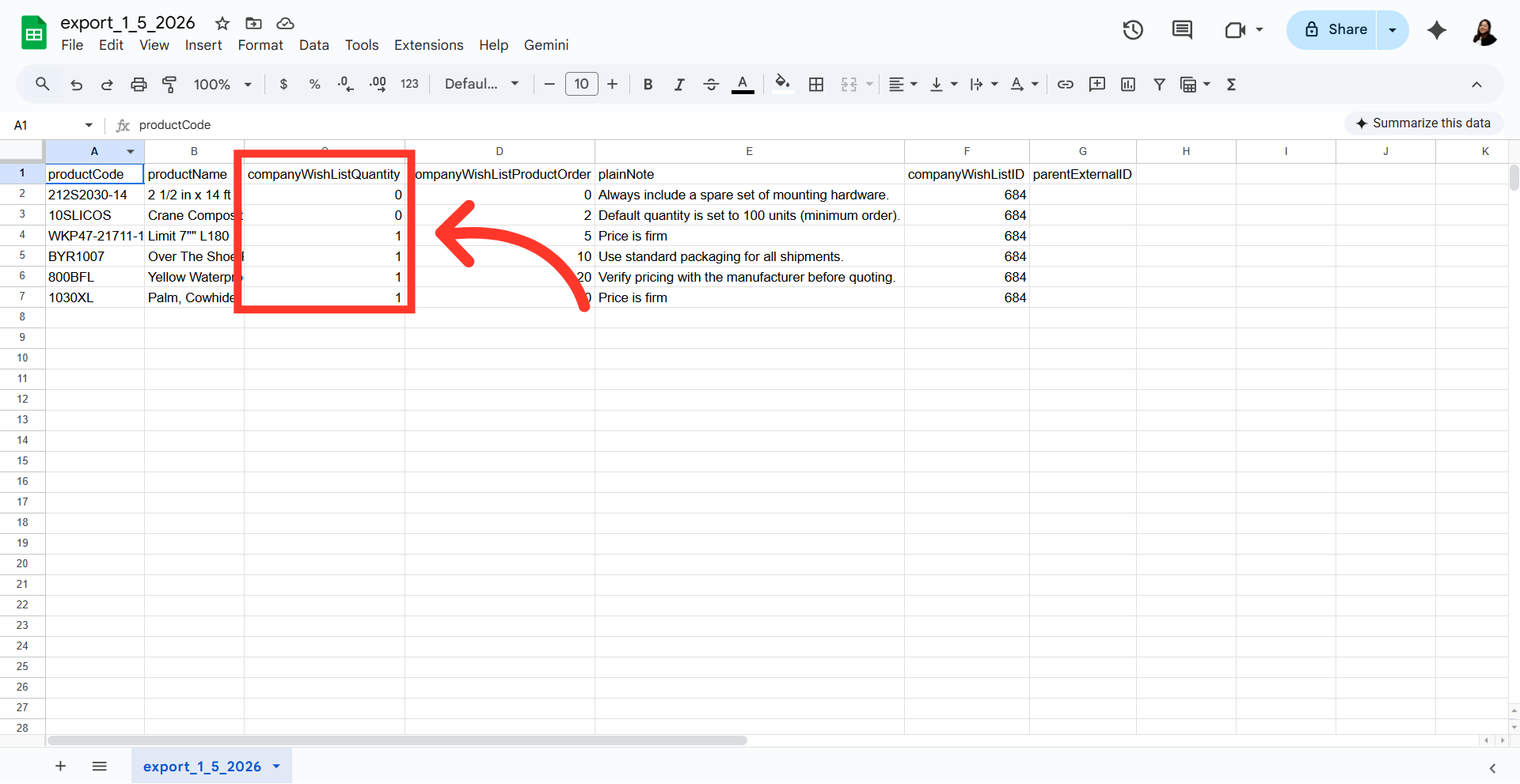 "companyWishListQuantity" is the product quantity. This is a numerical value and can be updated by import.