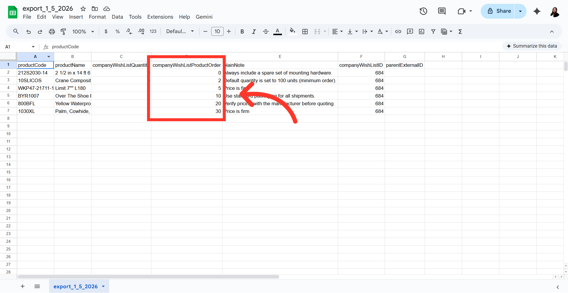 "companyWishListProductOrder" can also be updated by import. This can help order the products in your product list. The lower the value entered, the higher the product will be placed on the list.