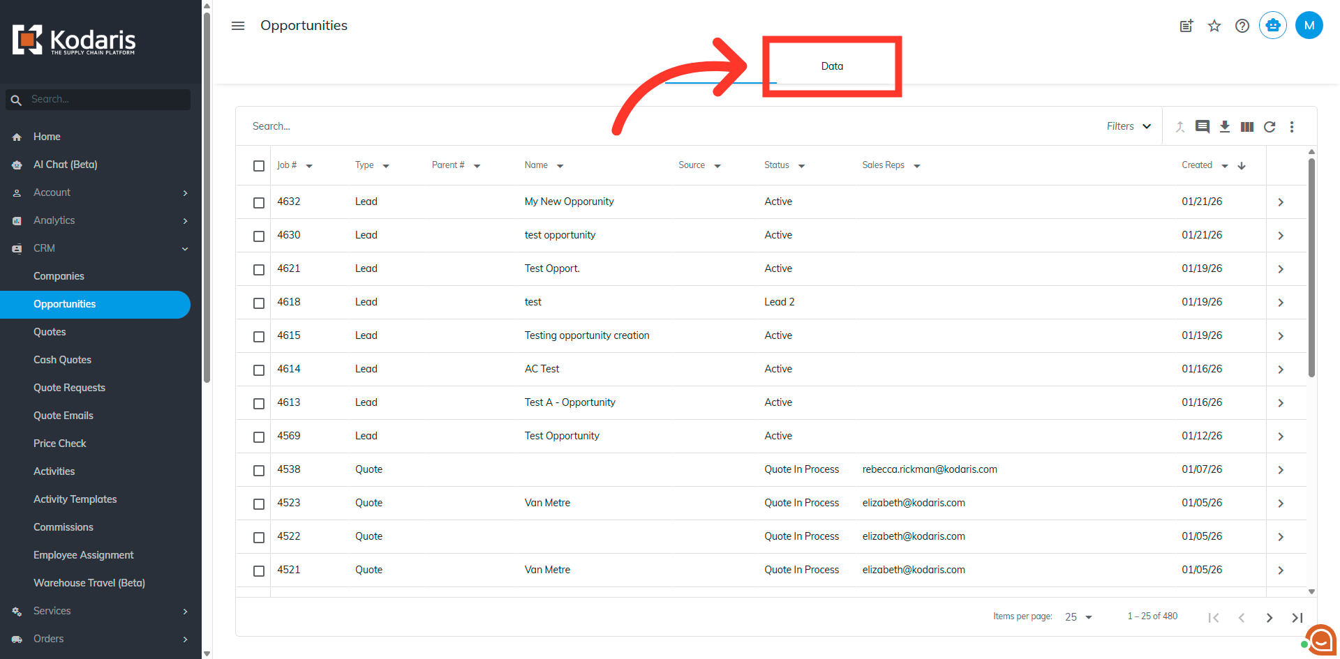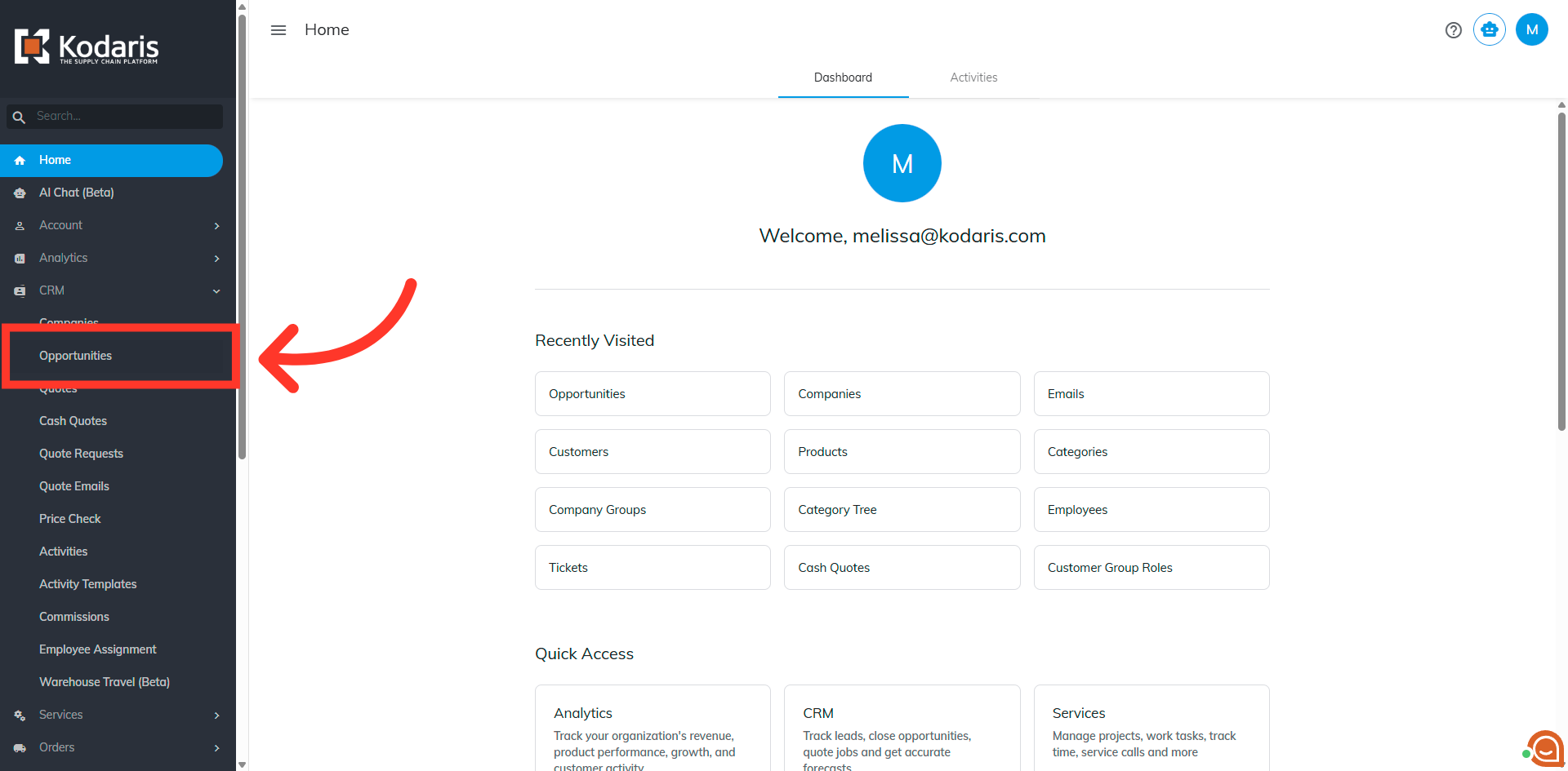Then, click "Opportunities". In order to access the "Opportunities" screen, you will need to be set up either as an "administrator" or a "superuser", or have the role: "dashboardSearch". To view and edit, the role "leadEdit" is needed.