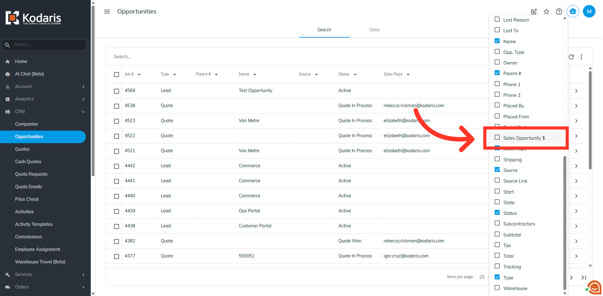 Select the checkbox for "Sales Opportunity $" so it will display on your screen.