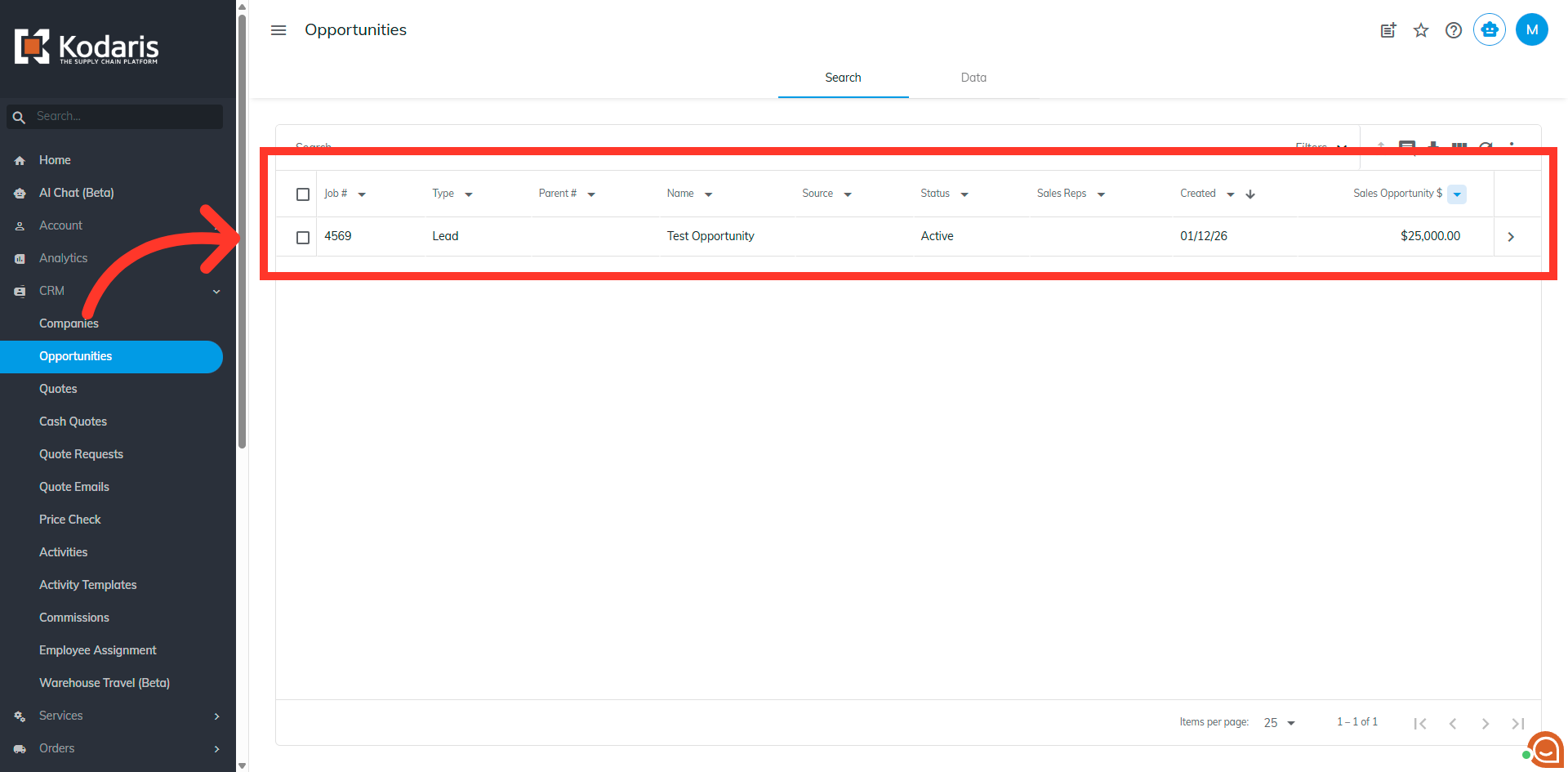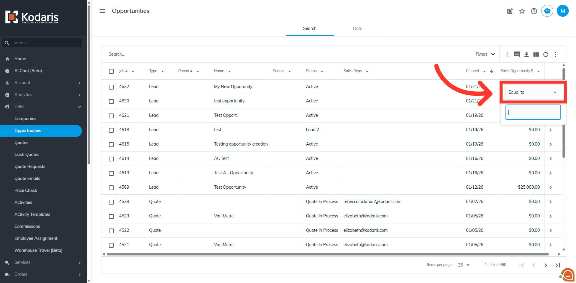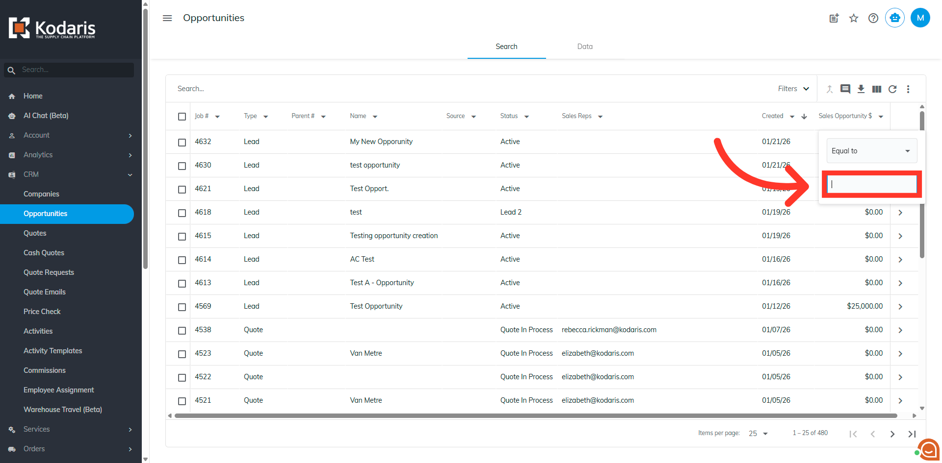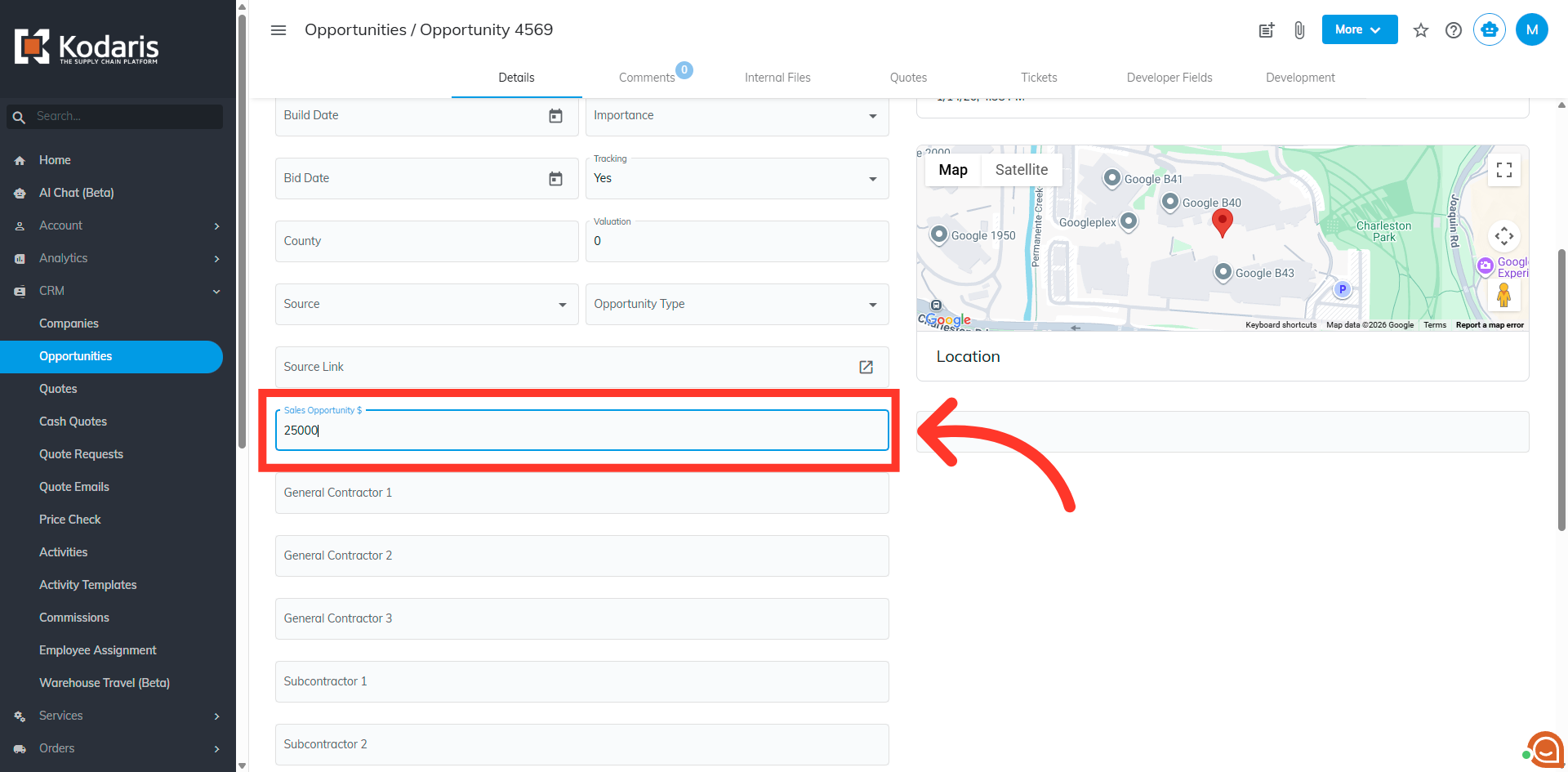 The "Sales Opportunity $" field allows users to enter and track sales opportunity values. To view and edit this field, navigate to the "CRM" section in the Operations Portal.