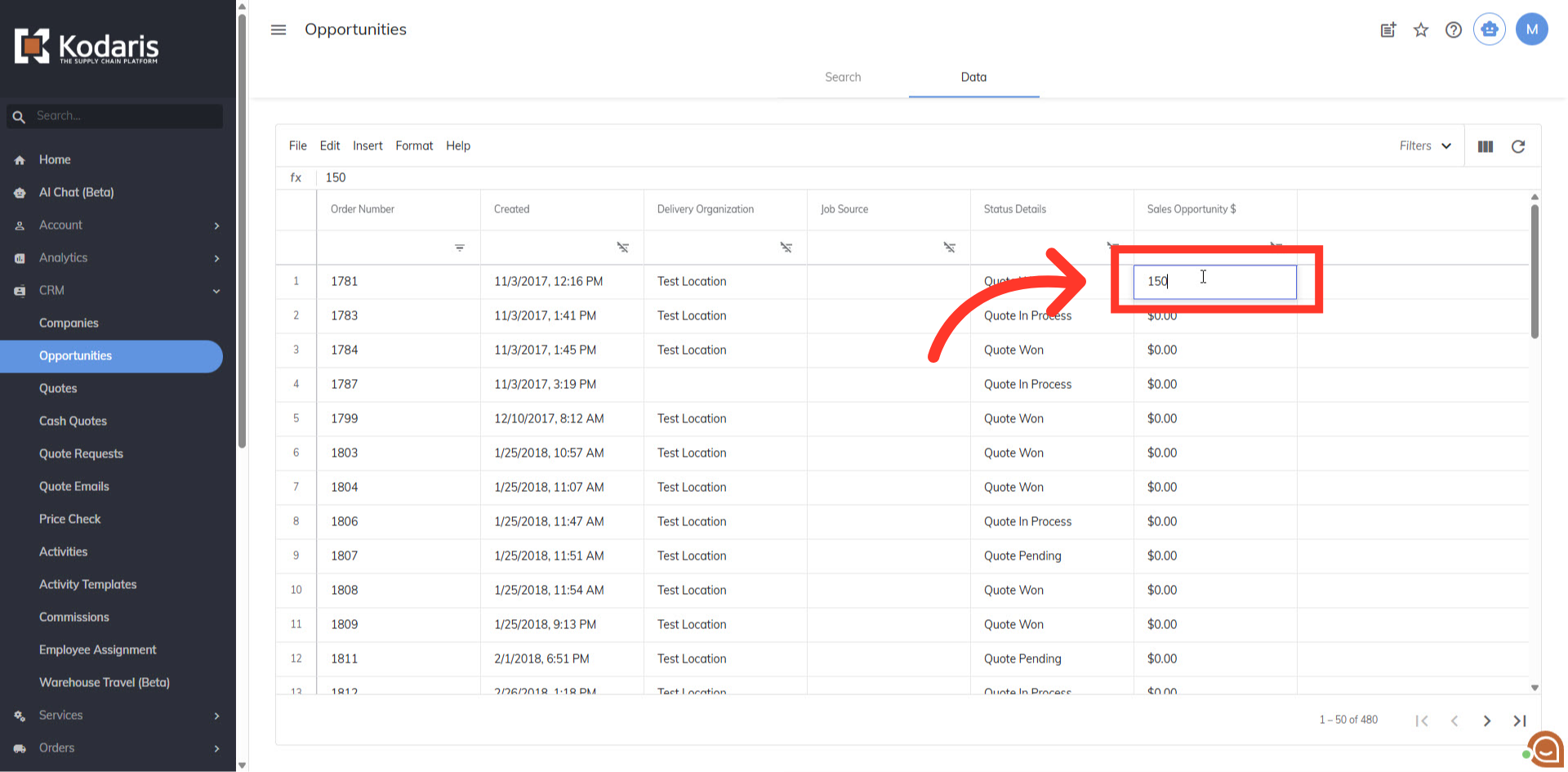 Now that the column is displayed in the grid, double click into the opportunity cell to edit the value. Click an part of the screen or press the "Enter" key to save the update.