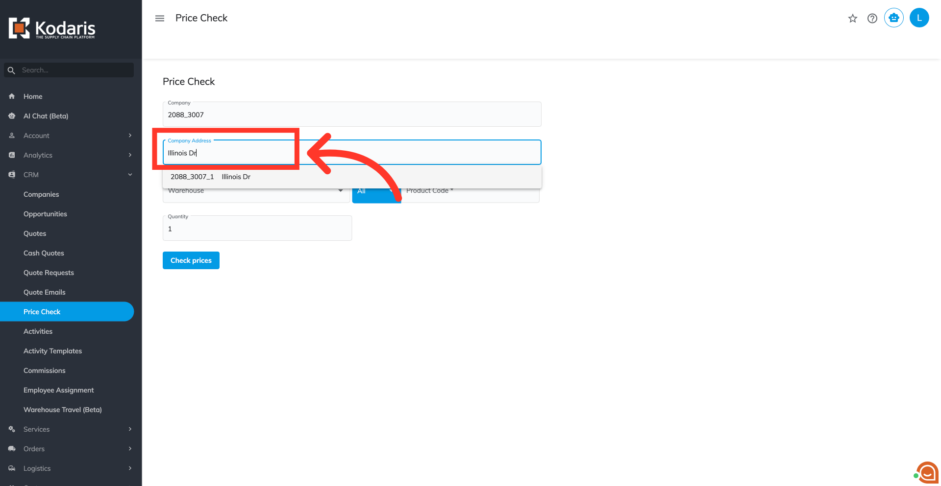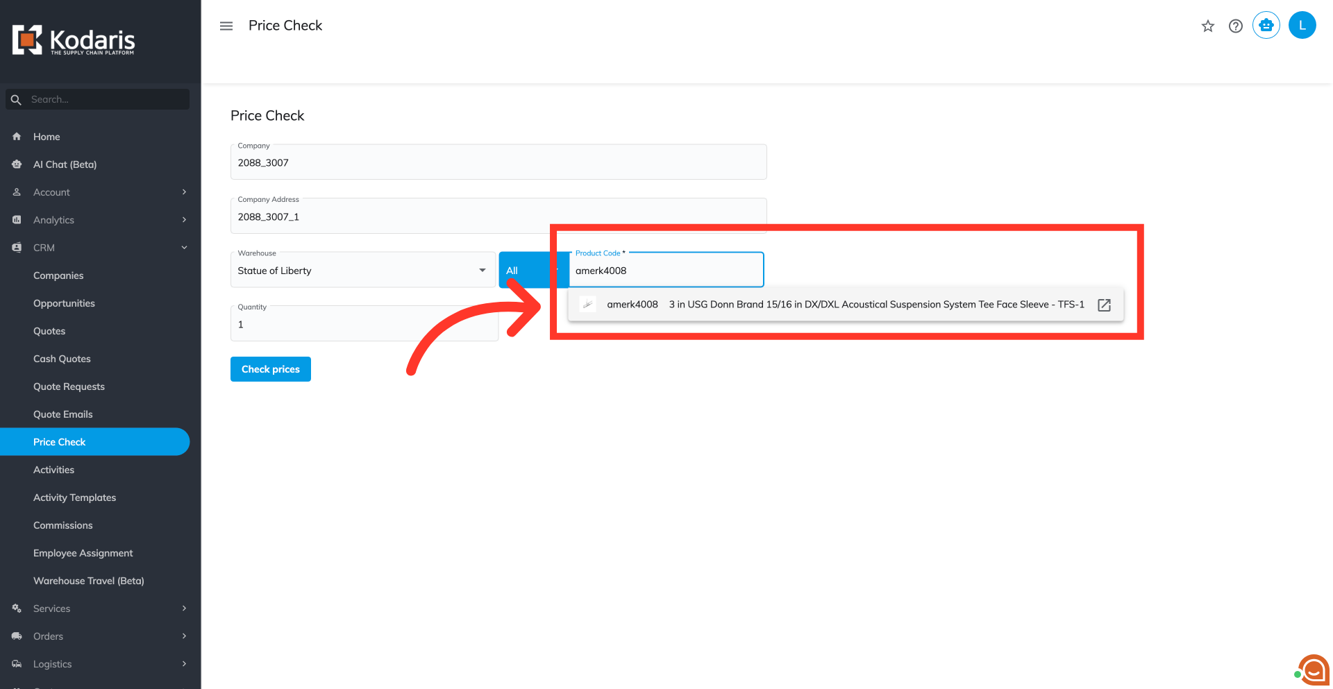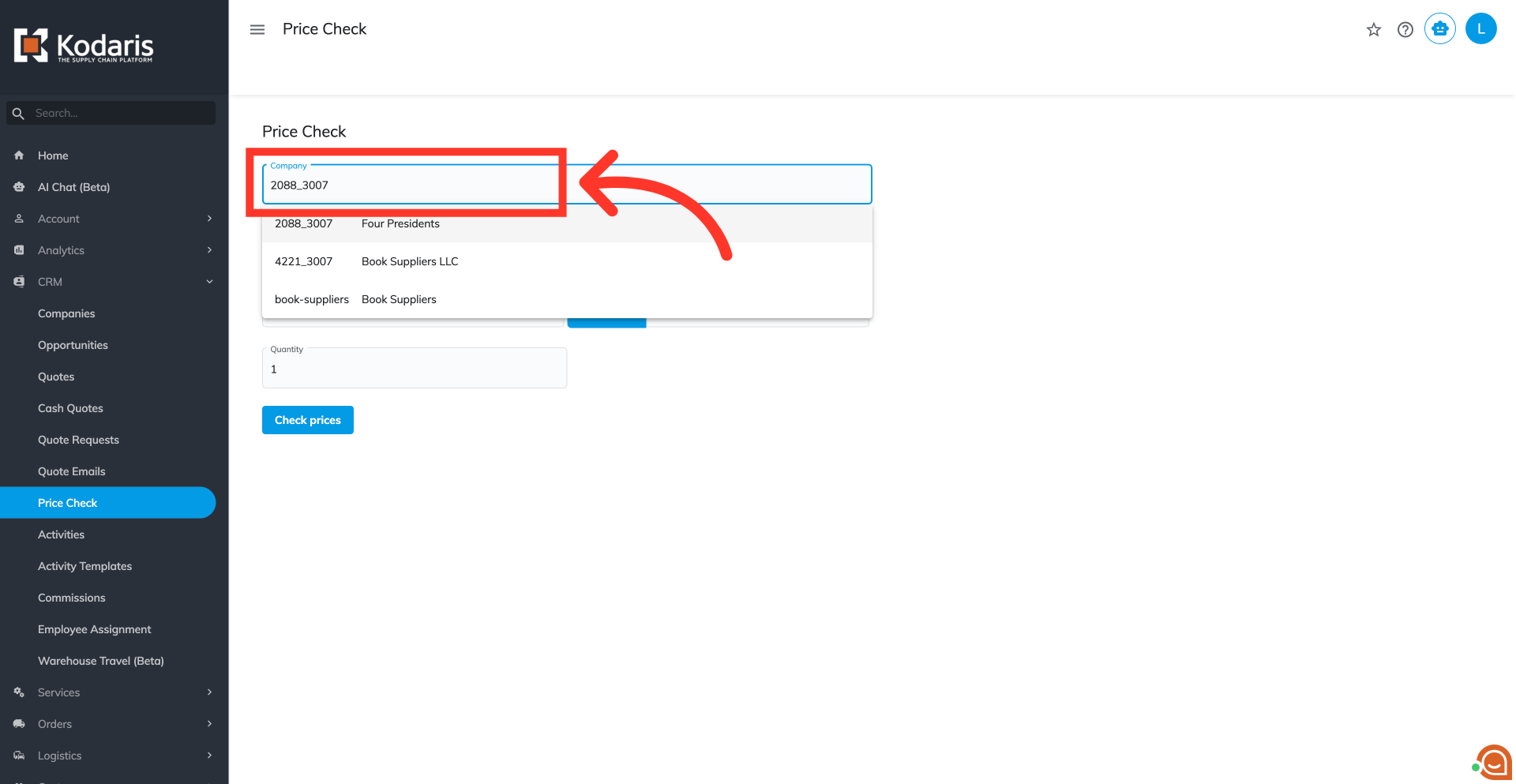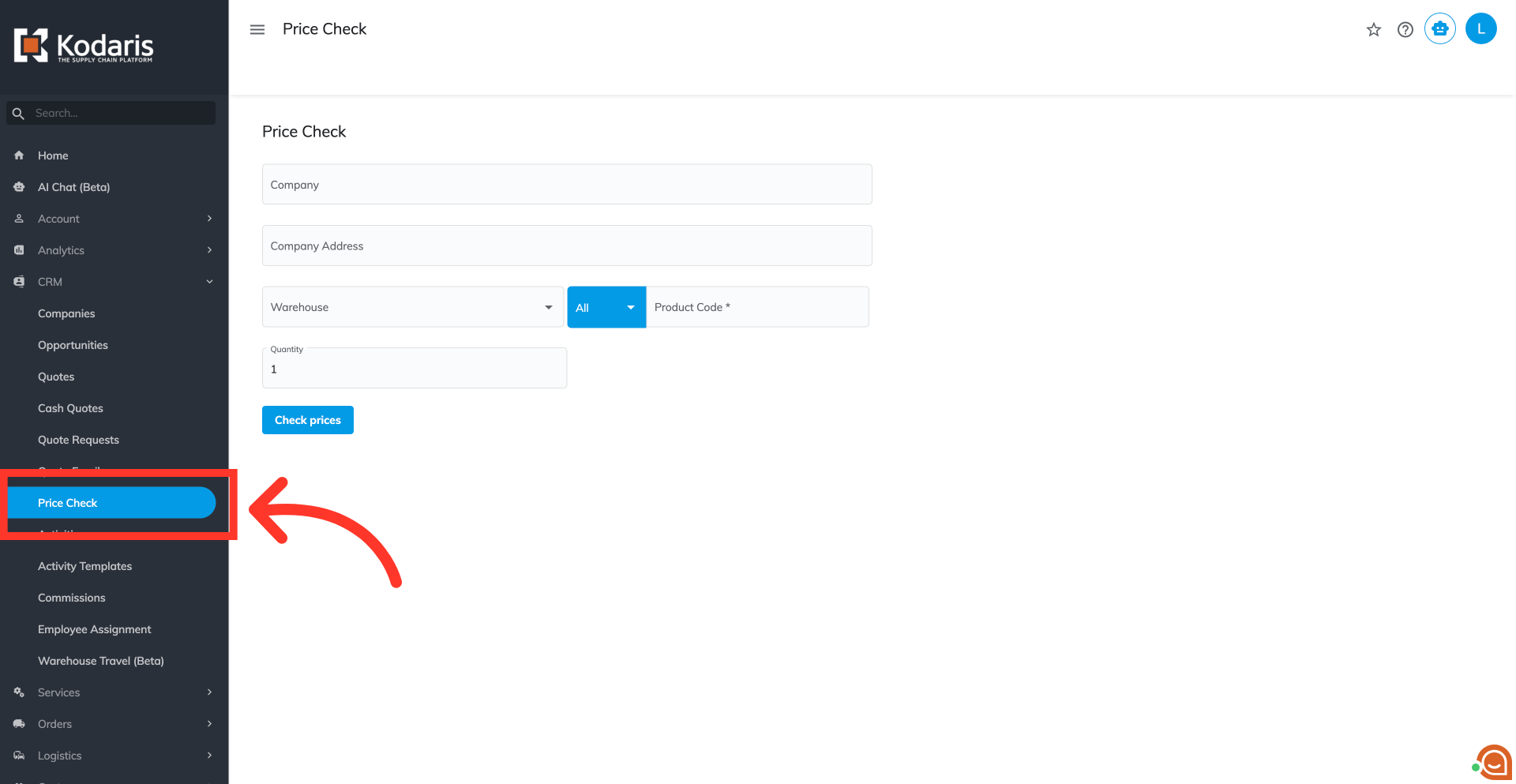Then, click on the "Price Check" screen. In order to access "Price Check", you will need to be set up either as an "administrator" or a "superuser", or have the roles of: "companyView", "companyAddressView", "productView", "orderView", and "productPriceView".