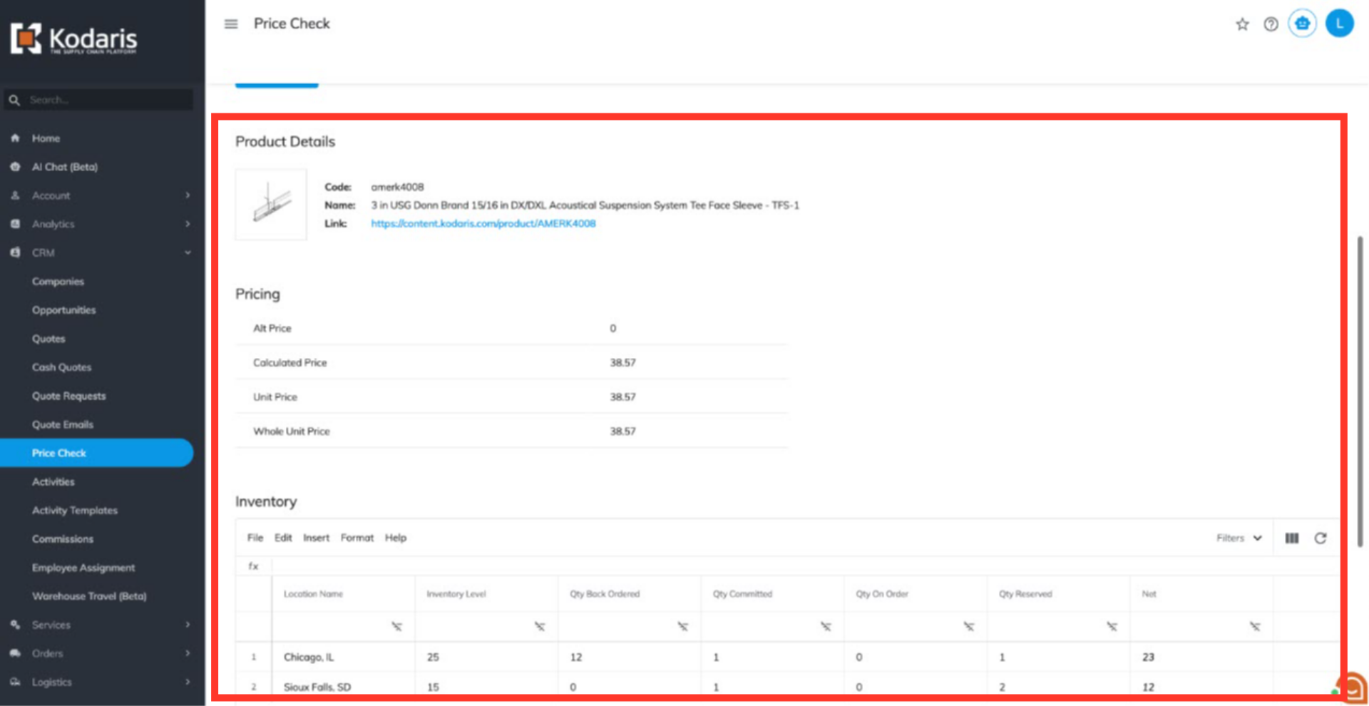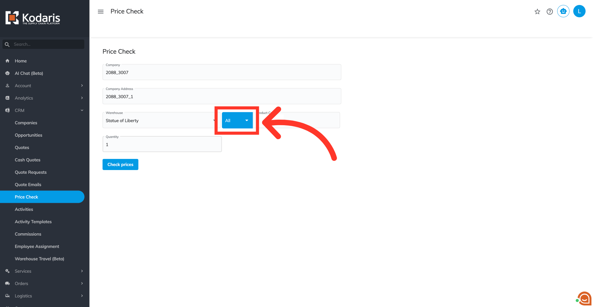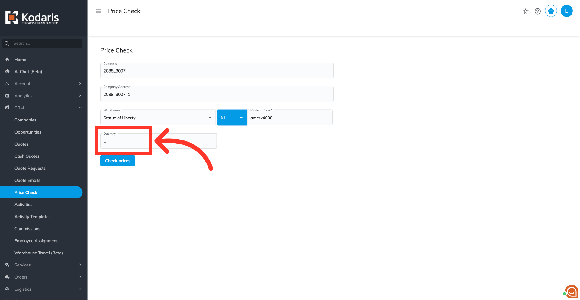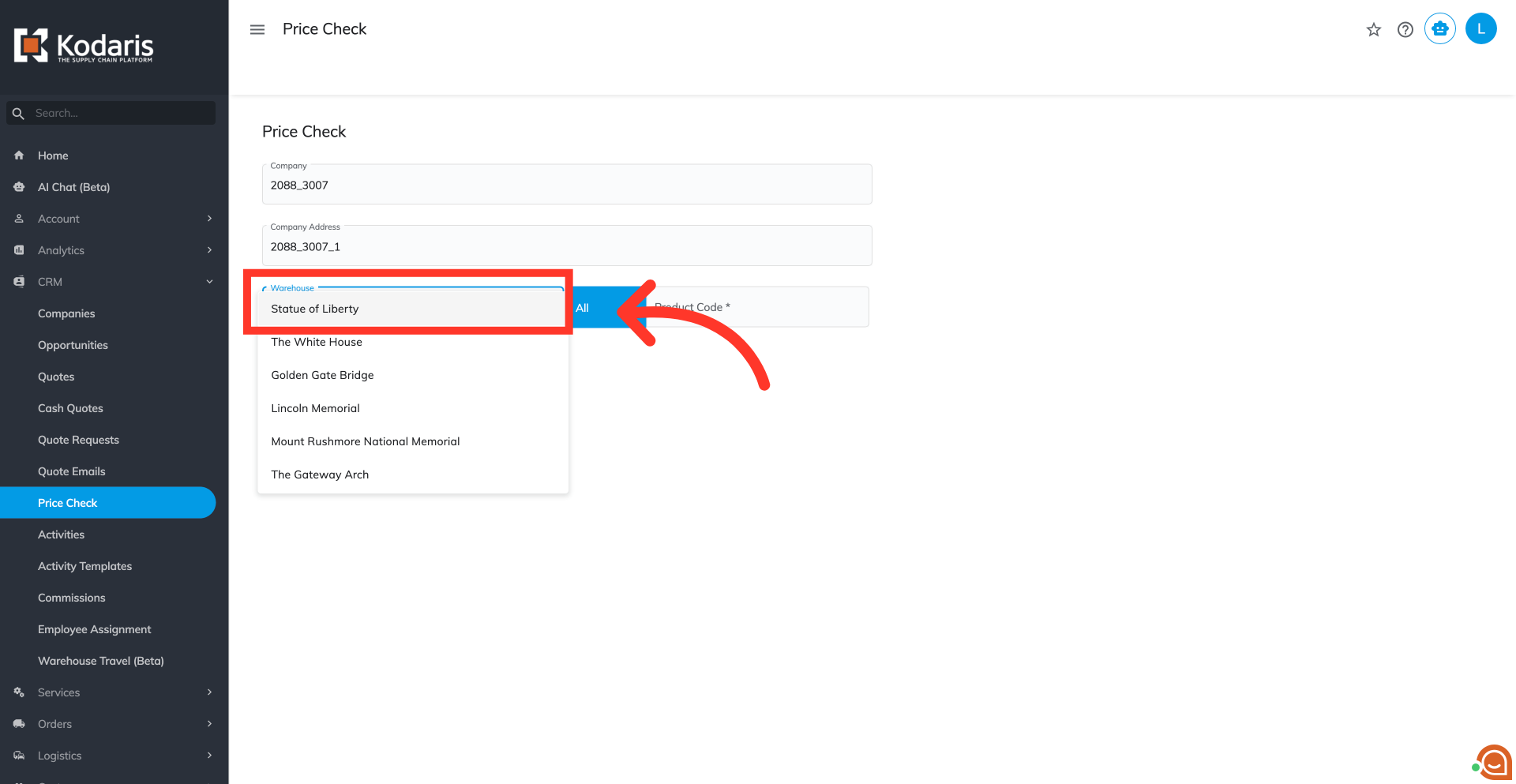 Then, click on the "Price Check" screen. In order to access "Price Check", you will need to be set up either as an "administrator" or a "superuser", or have the roles of: "companyView", "companyAddressView", "productView", "orderView", and "productPriceView".