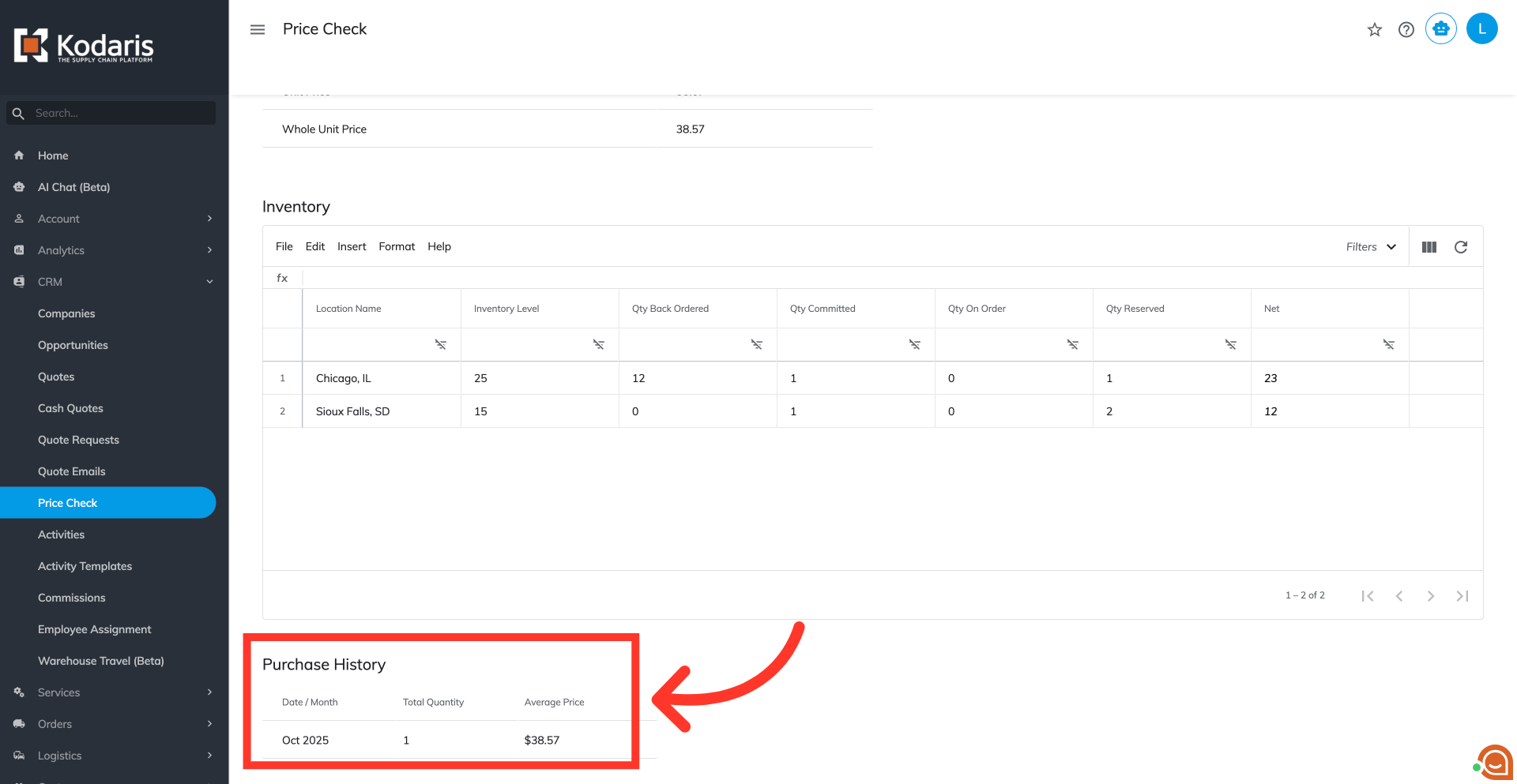 Scroll down to the "Purchase History" section to view past purchase dates, total quantity purchased, and the average purchase price of products.