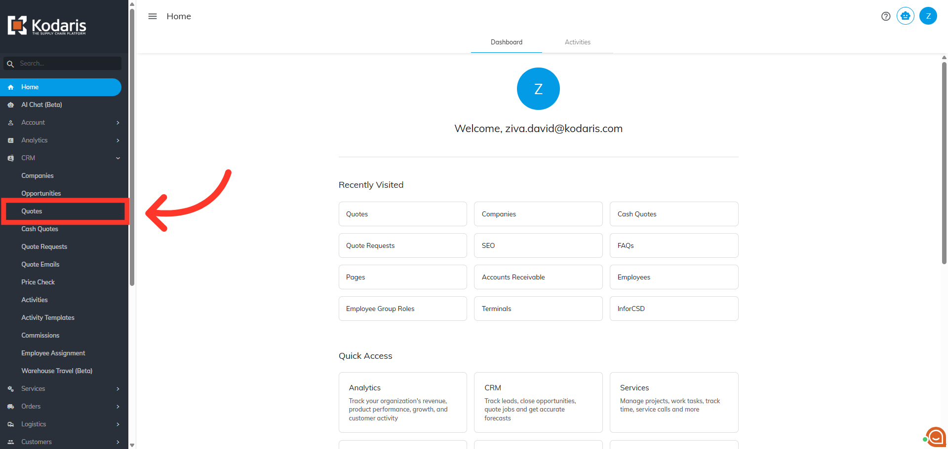 Then, click "Quotes". In order to access "Quotes", you will need to have the role of “administrator” or “superuser”, or have the roles of “quoteView", "quoteEdit” or “accountQuoting”.