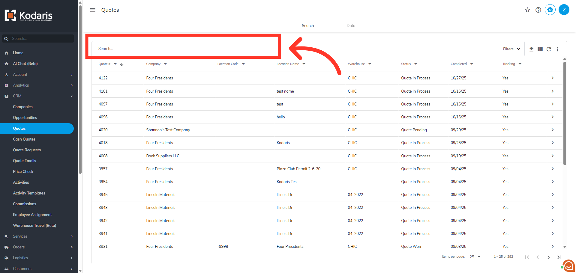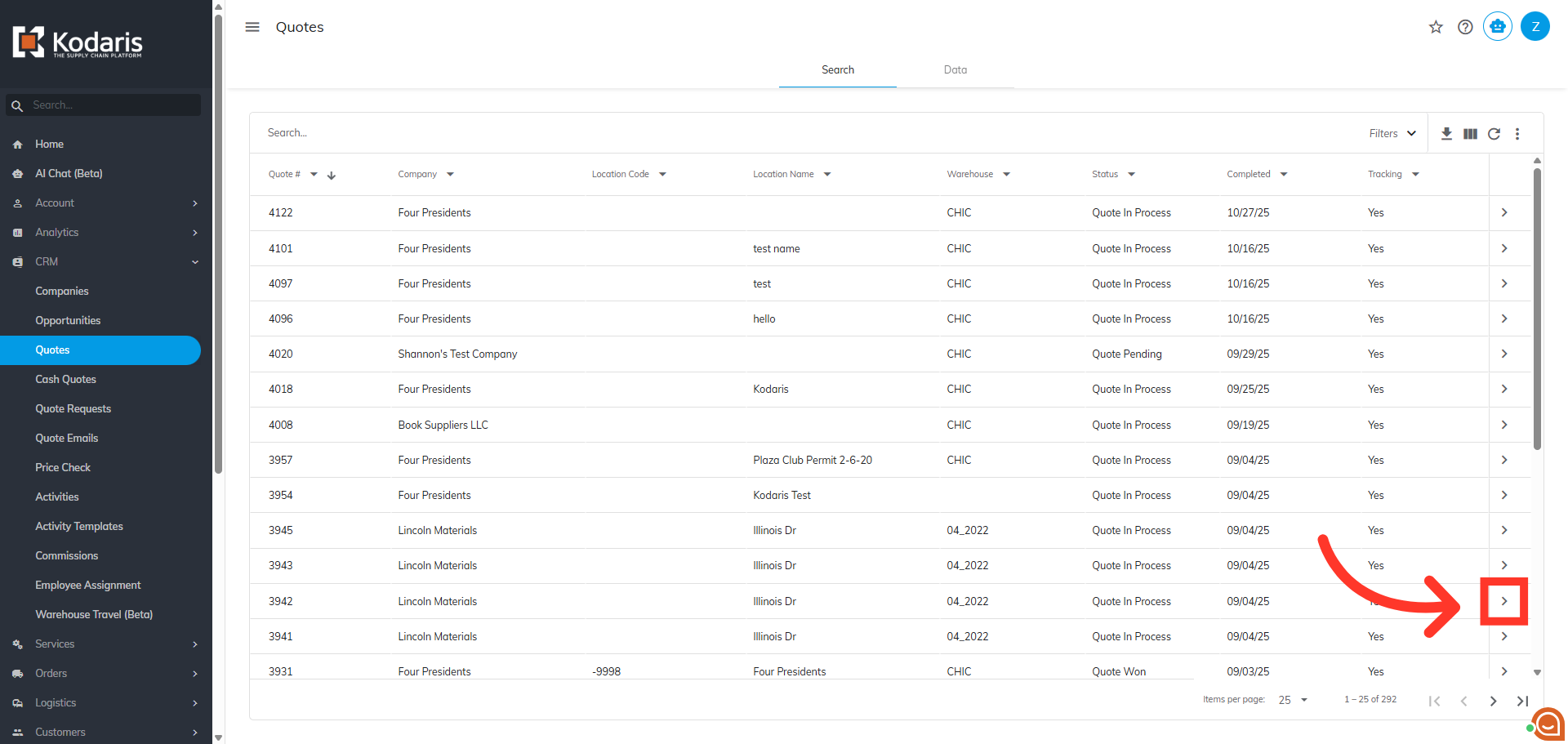 Search for the quote to which you would like to add additional charges. You can enter the quote number in the "Search" field to easily find the quote.