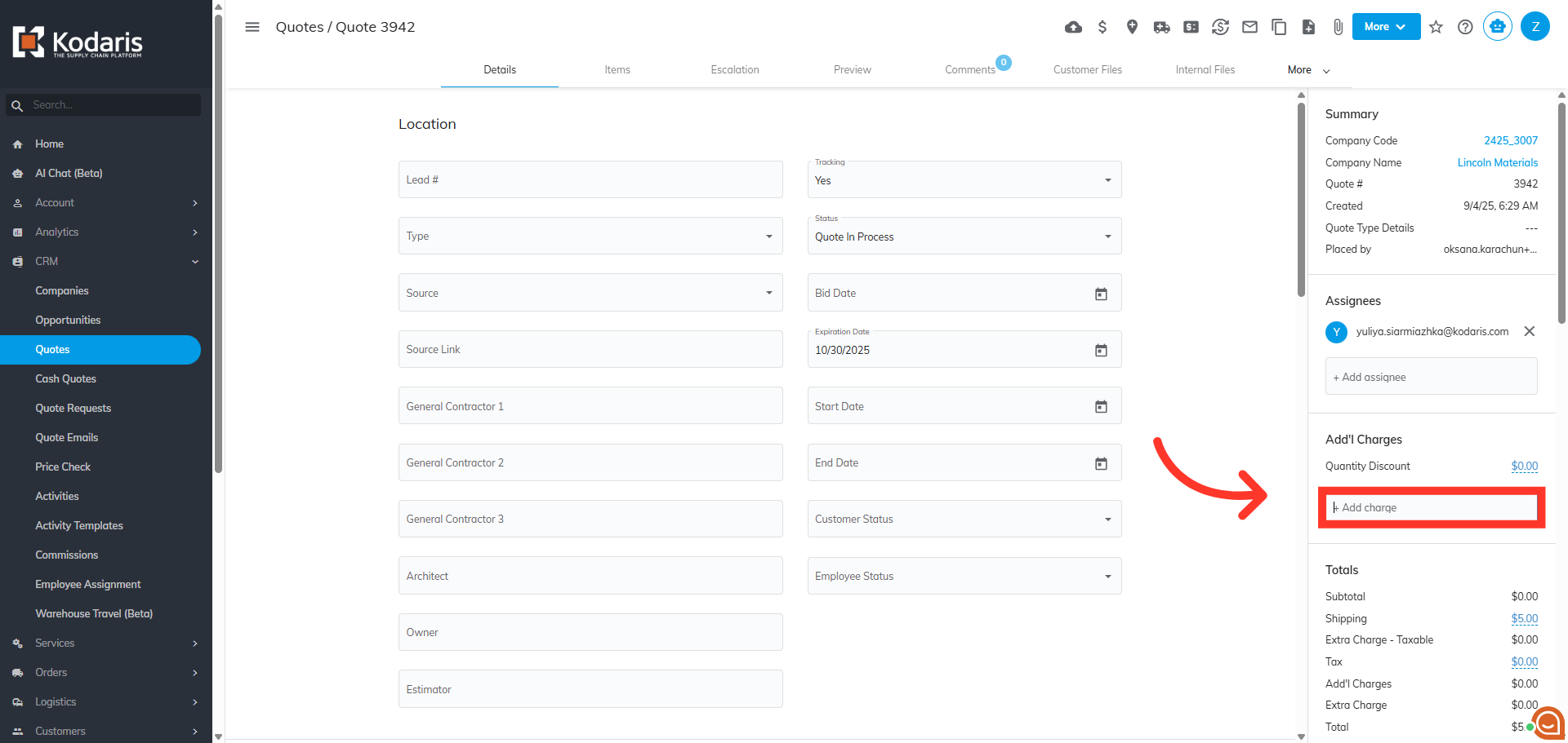 On the right side of the quote in the additional charges section you will see a field label of "+Add charge".