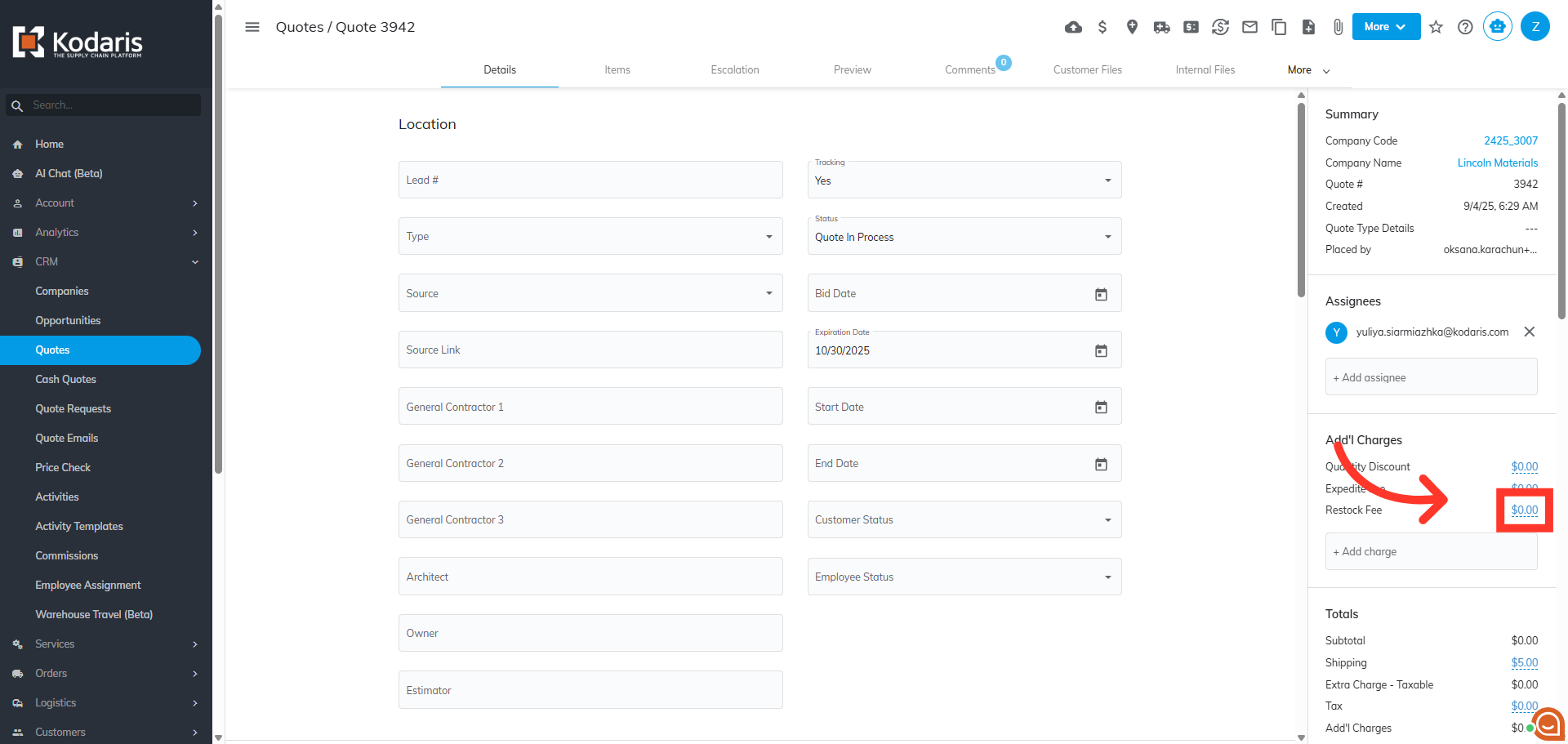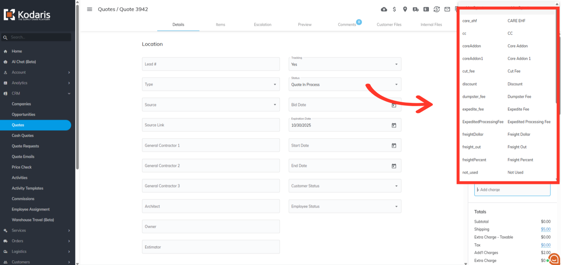 Next, click on the more details icon on the quote you wish to add charges to.