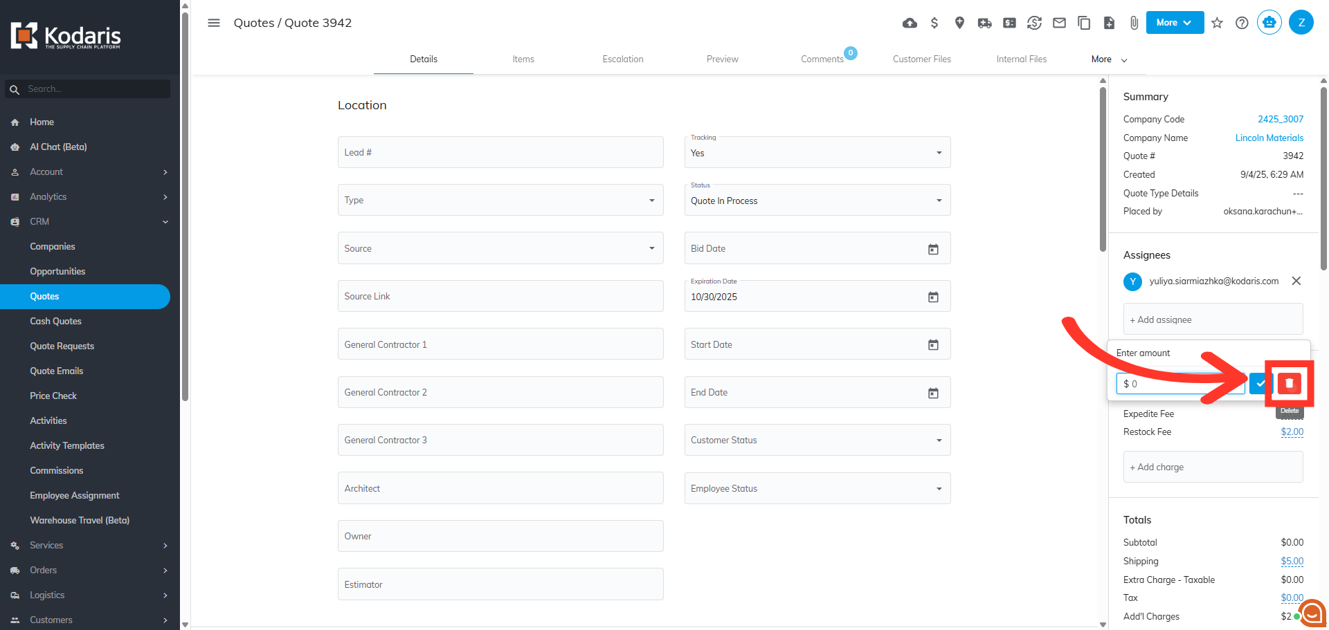 If needed, you can delete the charge from the quote by clicking the red delete icon.