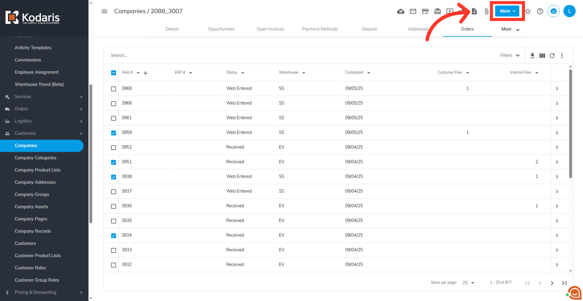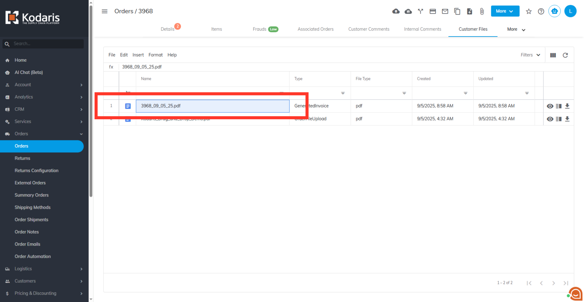 These PDFs will be automatically uploaded to each order, either in the "Customer files" or "Internal files" tab, depending on your selection. Go to the Orders screen and view the details of one of your selected orders. In order to access "Orders" you will need to be set up either as an "administrator" or a "superuser", or have the appropriate roles: "crmCompanyOrderView," "crmCompanyOrderEdit," "orderEdit," "orderView," and "dispatch." Use the search bar or column filters to find one of your orders. Enter the order name or a keyword to narrow your search, then access the order's details.