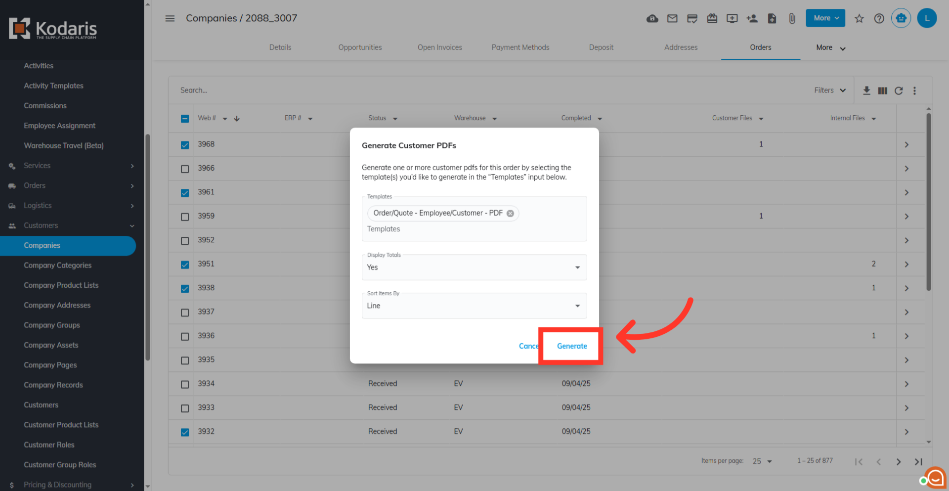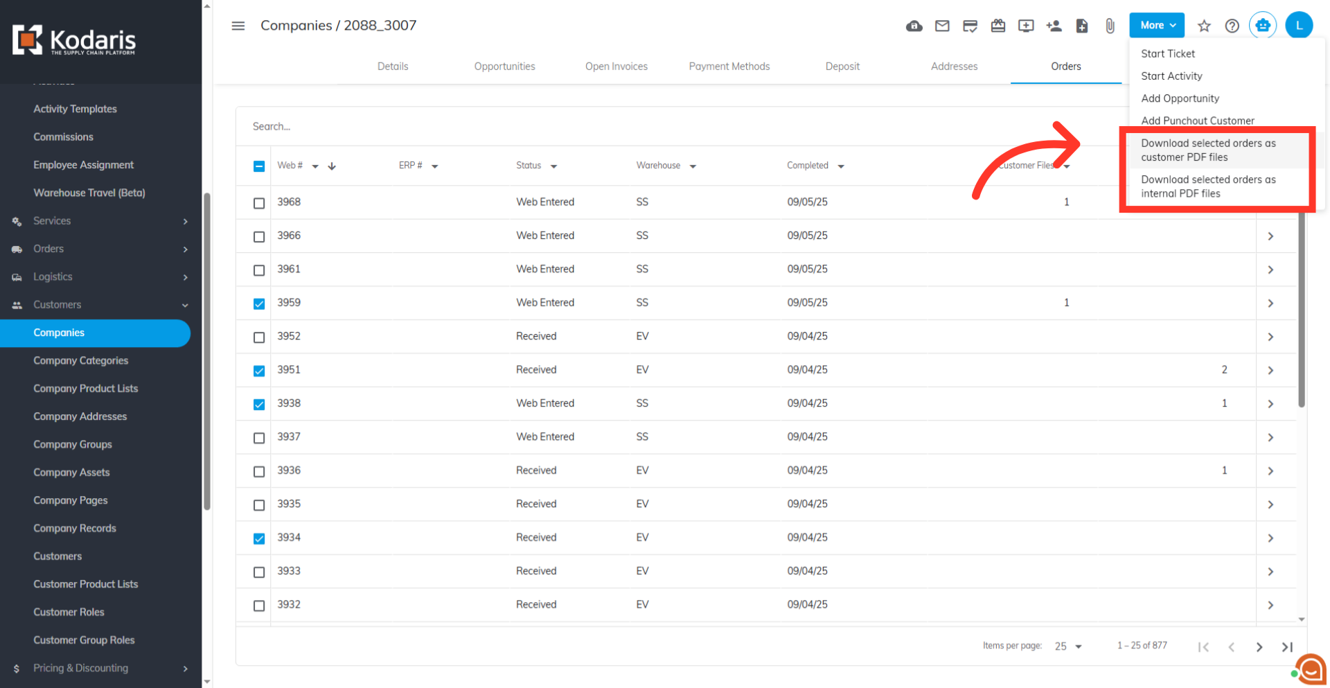 To generate PDF files from multiple orders on a company, navigate to the "Companies" section of your operations portal. In order to access "Companies" you will need to be set up either as an "administrator" or a "superuser", or have the appropriate roles: "companyView," "crmCompanyView," "companyEdit," "crmCompanyEdit," and "dispatch."