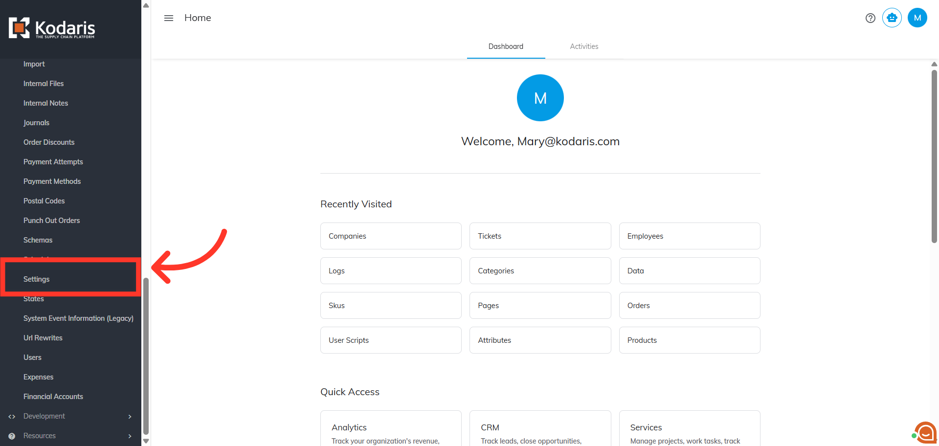 Click "Settings". In order to access and edit settings, you will need to be set up either as an “administrator” or a "superuser", or have the following roles: "settingEdit" and "settingView".