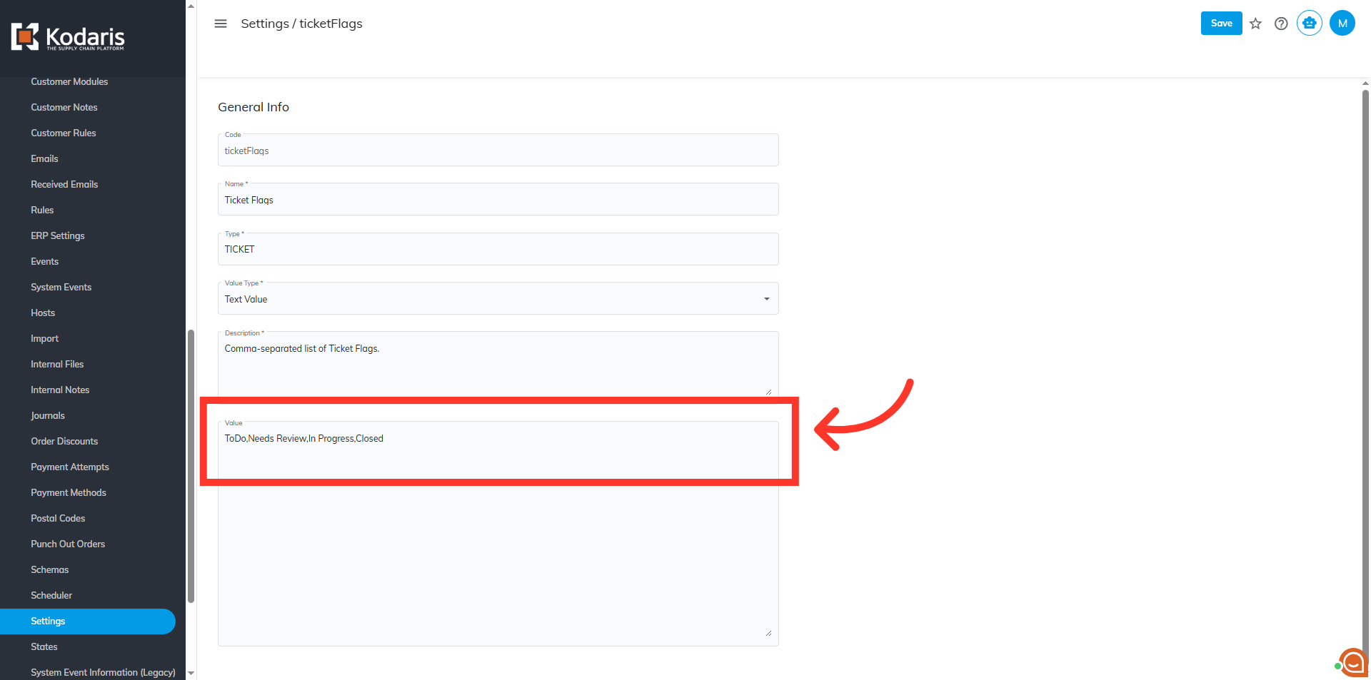 Enter the ticket flags values you preferred in the "Value" field, separated by commas.