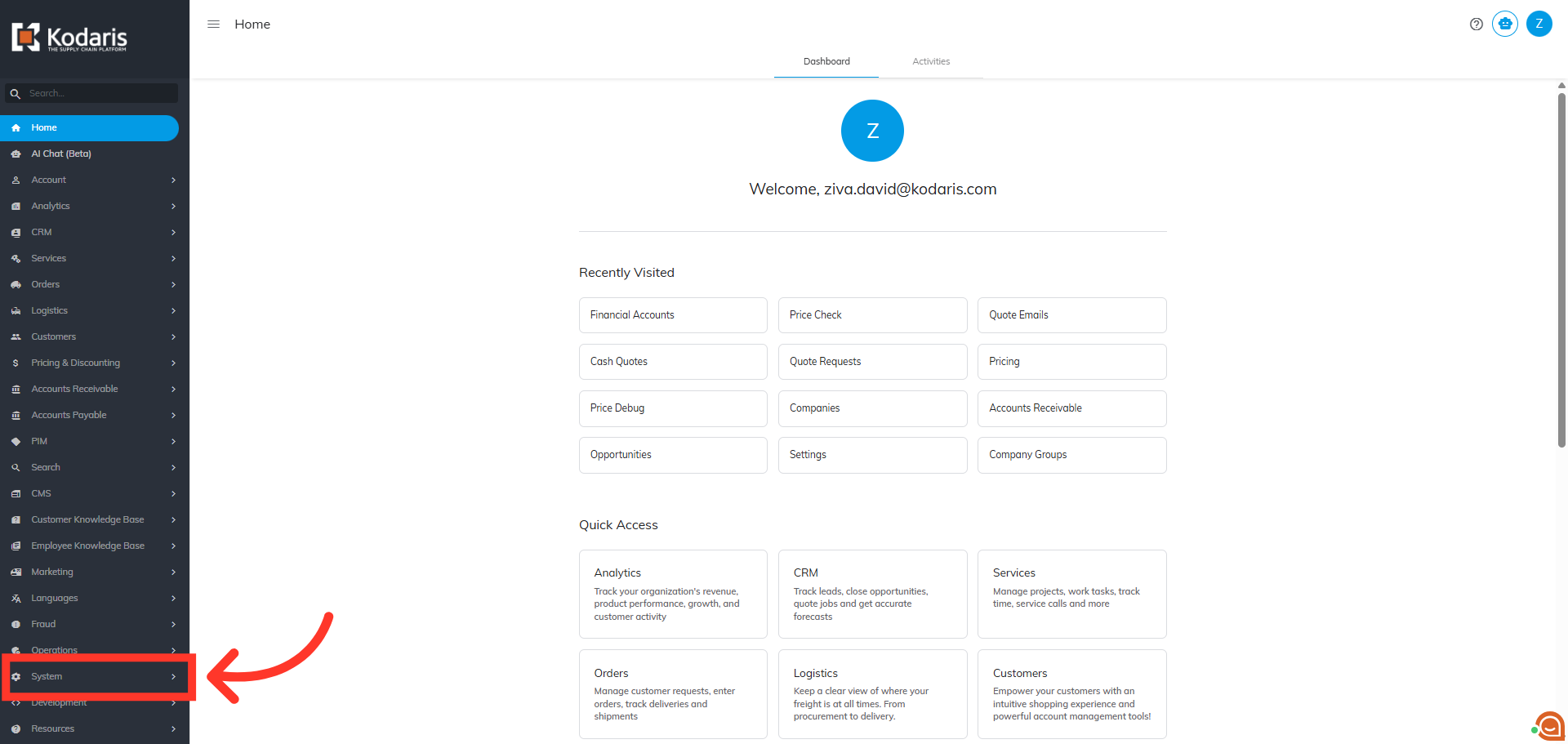 You can generate and export a report on store credits from the global Financial Account screen in the Operations Portal. First, navigate to "System".