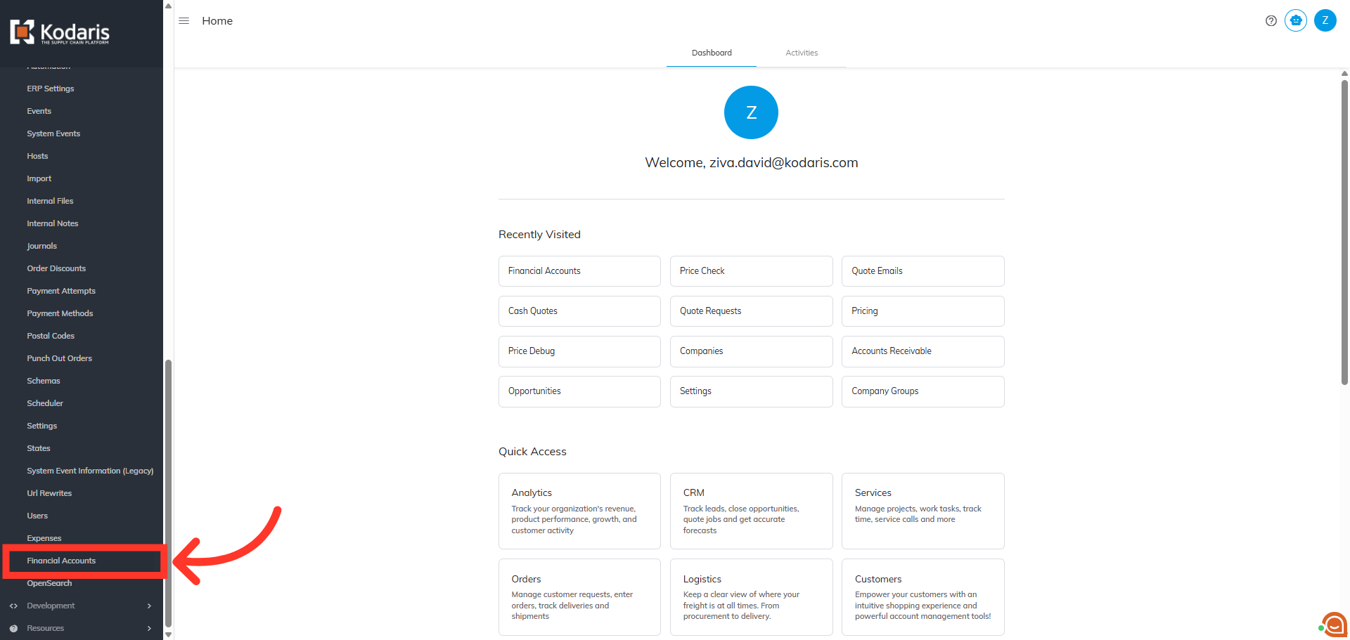Then, click "Financial Accounts". In order to access "Financial Accounts" you will need to be set up either as an “administrator” or a “superuser”, or have the roles of: “fiAccountView” and “fiAccountEdit”