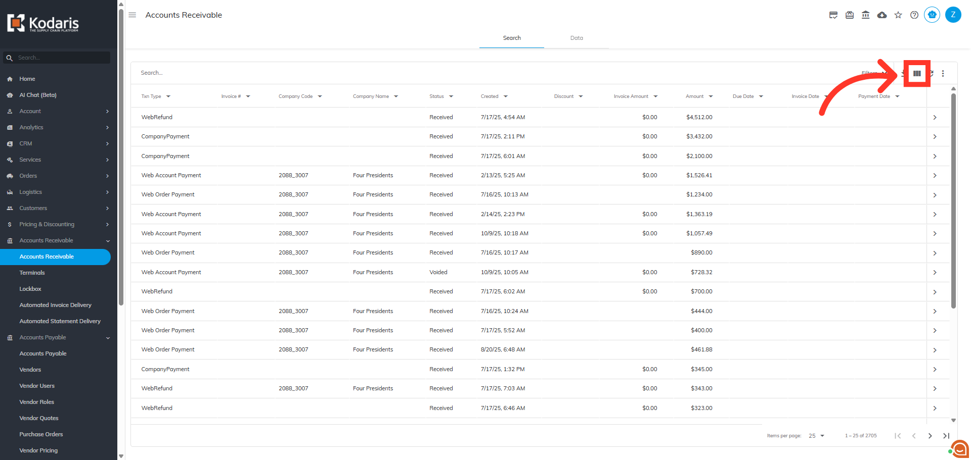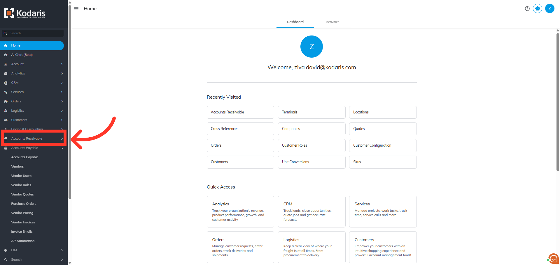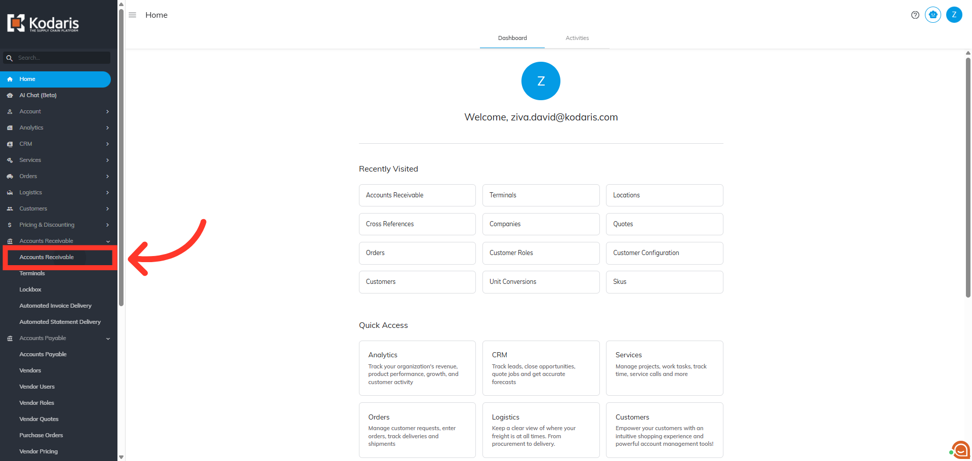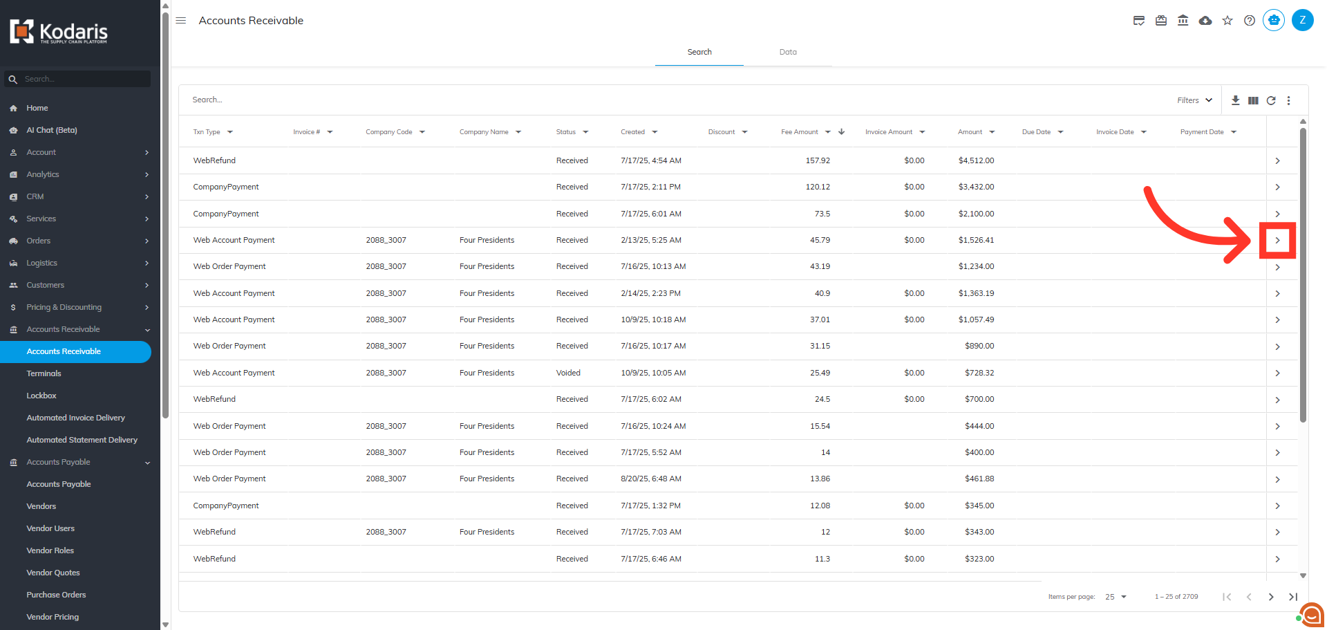 Then, click "Accounts Receivable" to view the transactions. In order to access "Accounts Receivable" you will need to be set up either as an "administrator" or a "superuser", or “accountant” or have the following roles: "paymentEdit” and “paymentView”.
