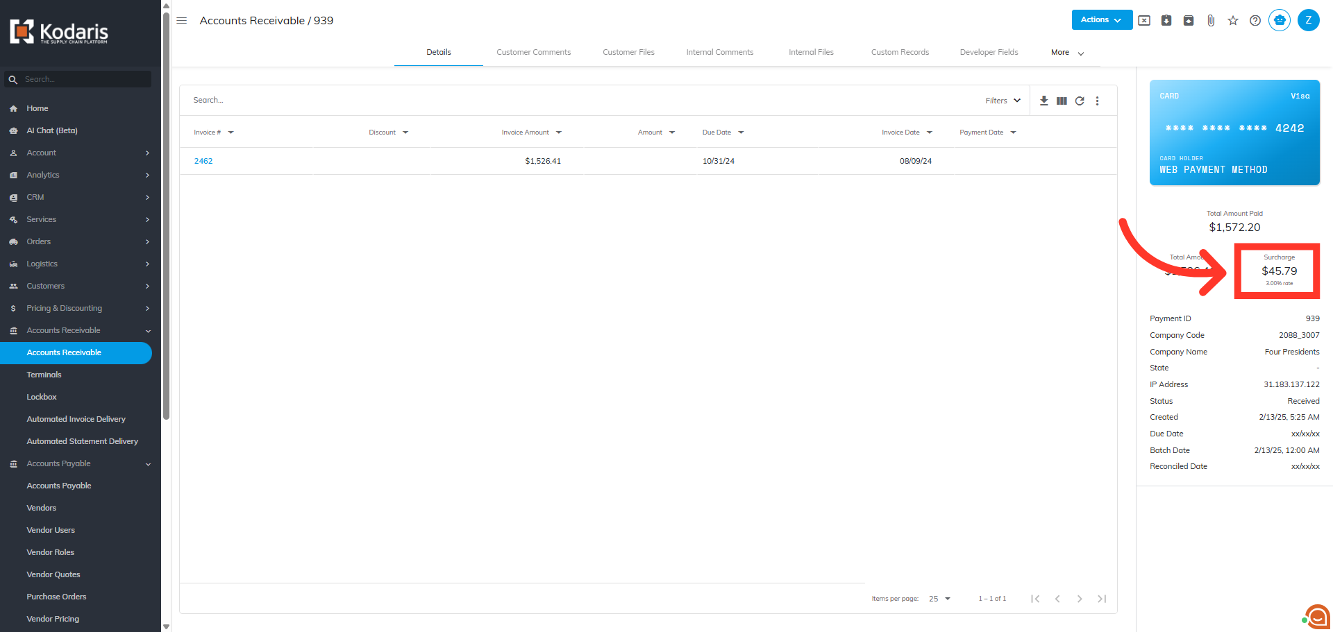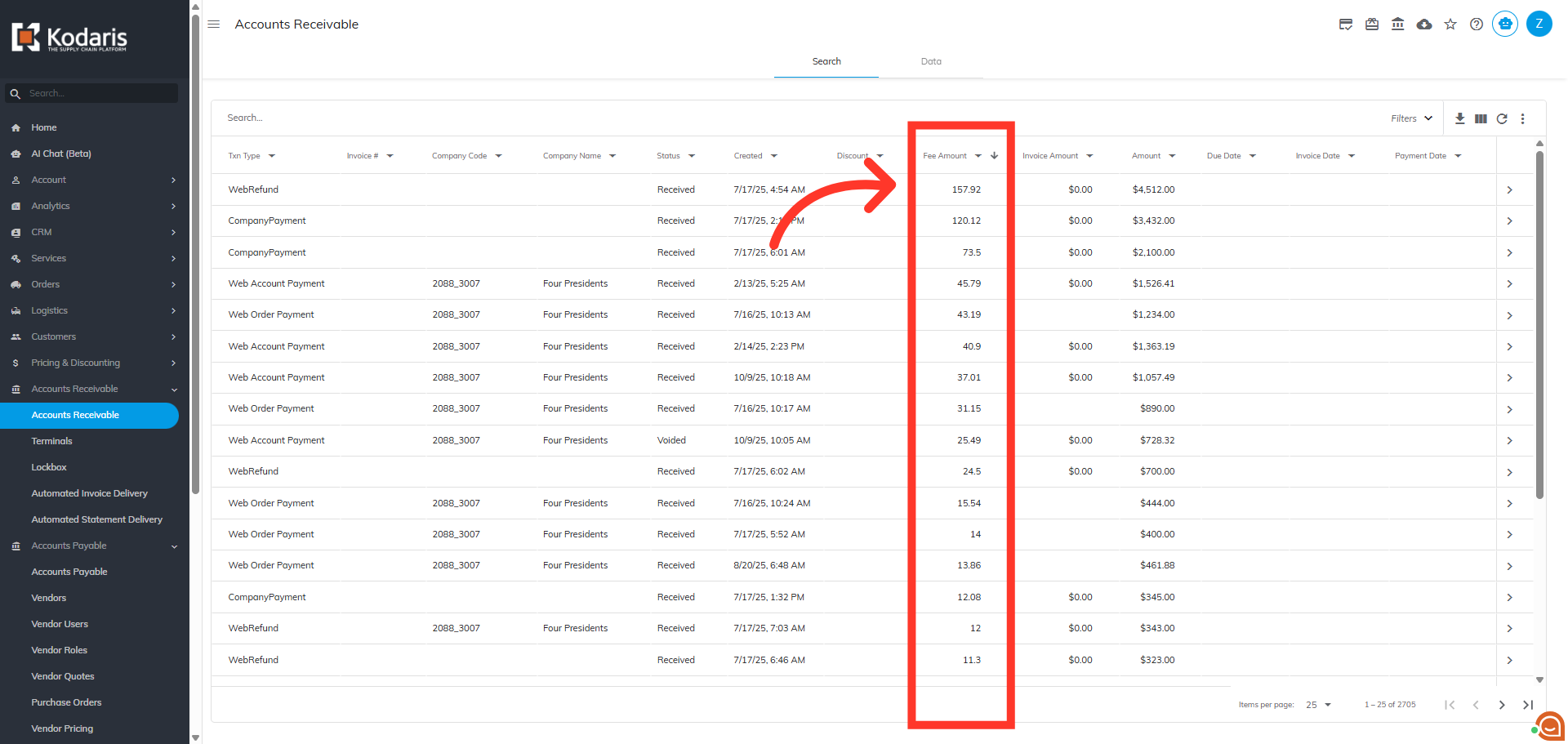 To verify if a fee has been added to a credit card transaction, you can view the "Fee Amount" in the Accounts Receivable screen in the Operations Portal. First, navigate to the "Accounts Receivable" section.